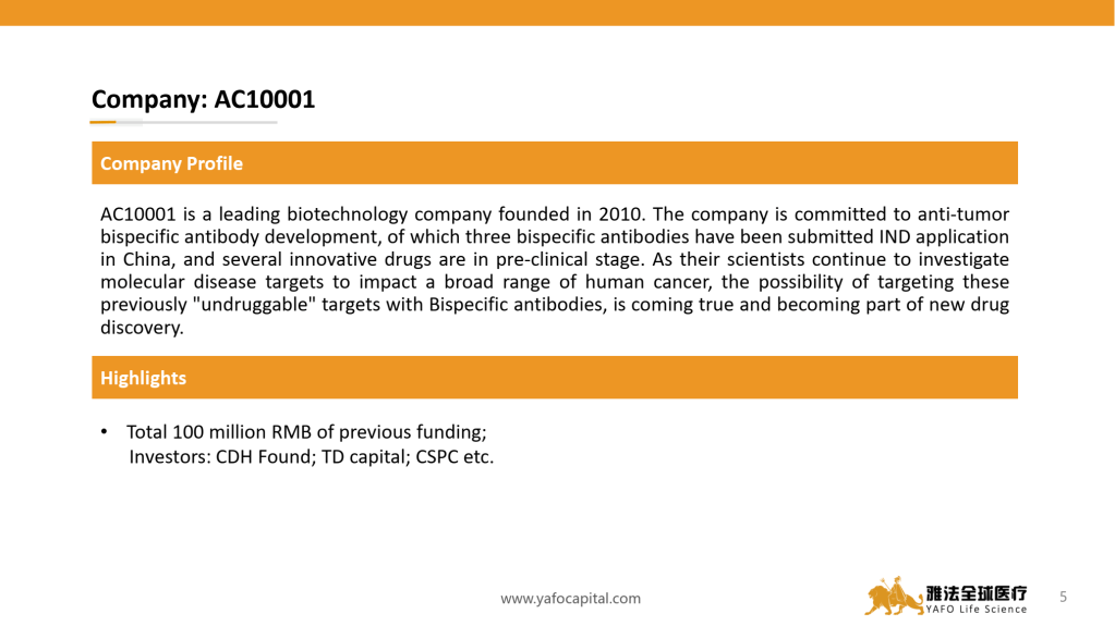AC10001 is a leading biotechnology company developing new class of innovative medicines based on breakthrough discovery in molecular biology. The company is committed to anti-tumor bispecific antibody development. The lead asset is an innovative humanized bispecific antibody for the treatment of malignant ascites. Its phase II study is in preparation, and phase I study shows excellent ascites control and clearance efficacy.