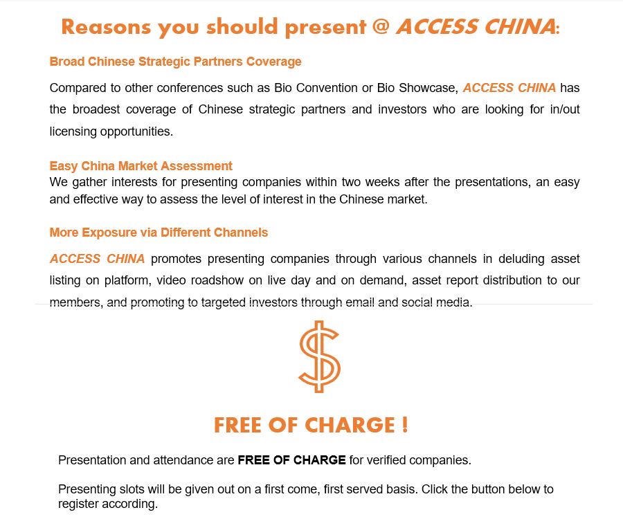 ACCESS CHINA is the most effective deal-making platform for Western pharma and biotech leaders looking to enter or expand in the Chinese market. ACCESS CHINA creates invaluable BD opportunities by directly connecting and meeting with the right partners for development, licensing or commercial collaborations.