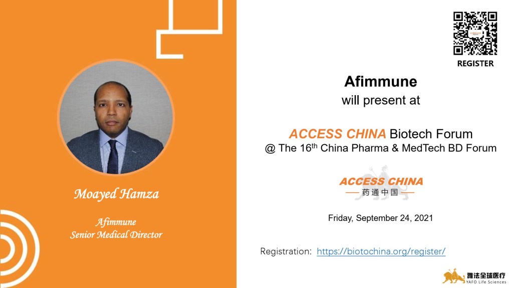 September 18th, 2021 (Shanghai) — We are glad to announce that Moayed Hamza, Senior Medical Director of Afimmune, has been invited to showcase at ACCESS CHINA Biotech Forum on Thursday, September 23, 2021 at 9:00 p.m. ET. ACCESS CHINA Biotech Forum is the largest online corporate access event between China and the western biopharma industry.