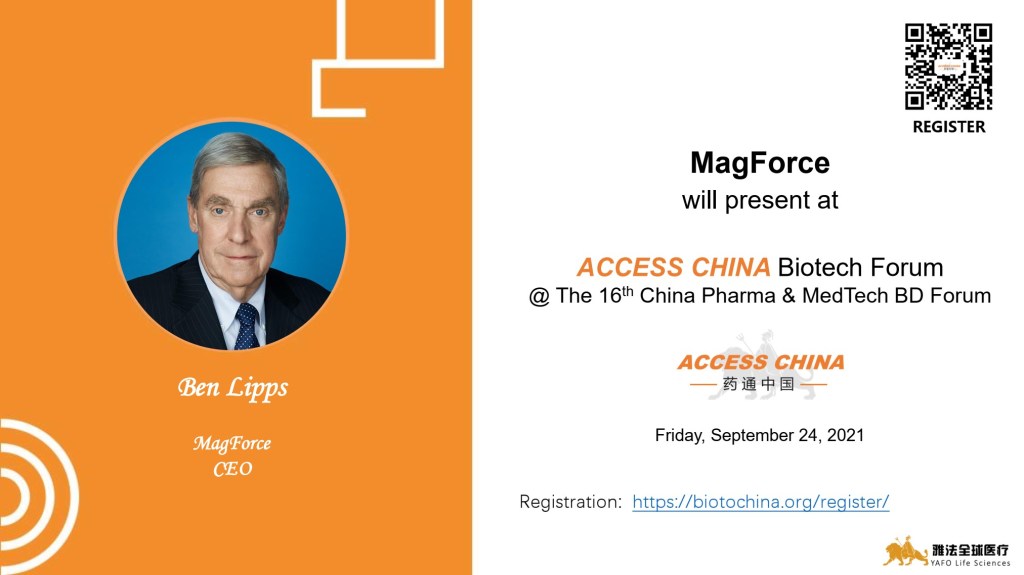 September 18th, 2021 (Shanghai) — We are glad to announce that Ben Lipps, CEO of MagForce, has been invited to showcase at ACCESS CHINA Biotech Forum on Thursday, September 23, 2021 at 9:00 p.m. ET. ACCESS CHINA Biotech Forum is the largest online corporate access event between China and the western biopharma industry.