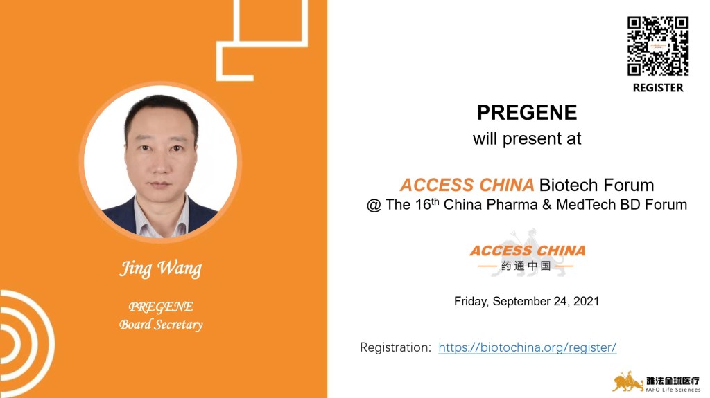 September 18th, 2021 (Shanghai) — We are glad to announce that Jing Wang, Board Secretary of PREGENE, has been invited to showcase at ACCESS CHINA Biotech Forum onThursday, September 23, 2021 at 9:00 p.m. ET. ACCESS CHINA Biotech Forum is the largest online corporate access event between China and the western biopharma industry.