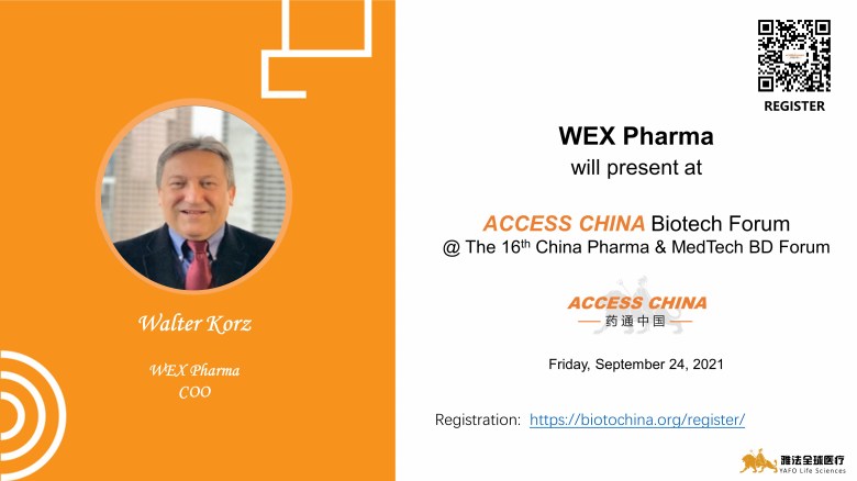 September 18th, 2021 (Shanghai) — We are glad to announce that Walter Korz, the COO of WEX Pharma, has been invited to showcase at ACCESS CHINA Biotech Forum on Thursday, September 23, 2021 at 9:00 p.m. ET. ACCESS CHINA Biotech Forum is the largest online corporate access event between China and the western biopharma industry.