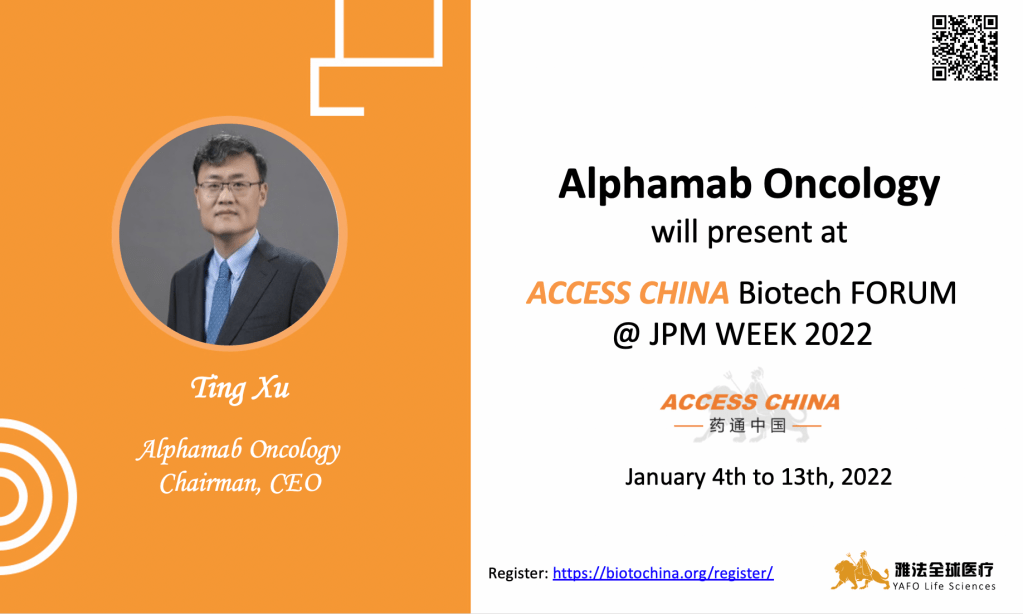 December 26th, 2021 (Shanghai) — We are glad to announce that Ting Xu, the Chairman, CEO of Alphamab Oncology, has been invited to showcase at ACCESS CHINA Biotech Forum during Jan 4th – Jan13th. ACCESS CHINA Biotech Forum is the largest online corporate access event between China and the western biopharma industry.