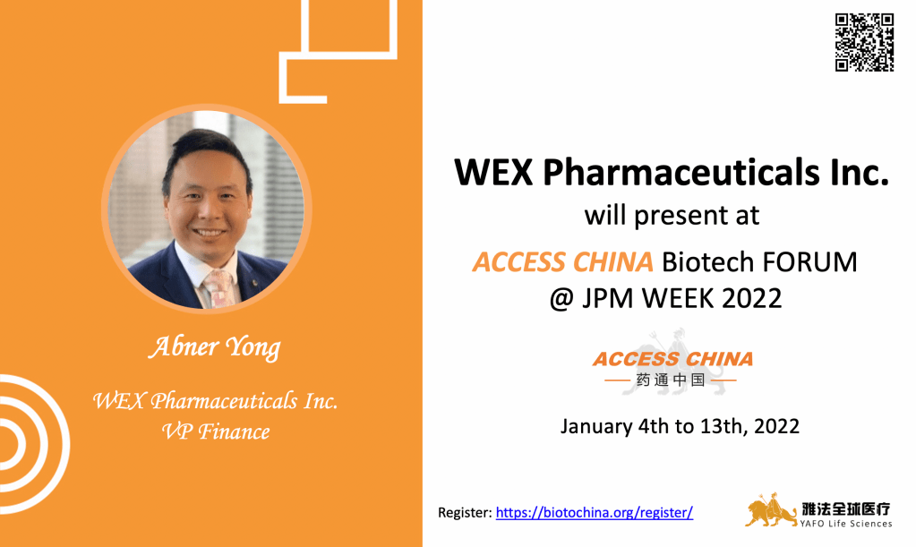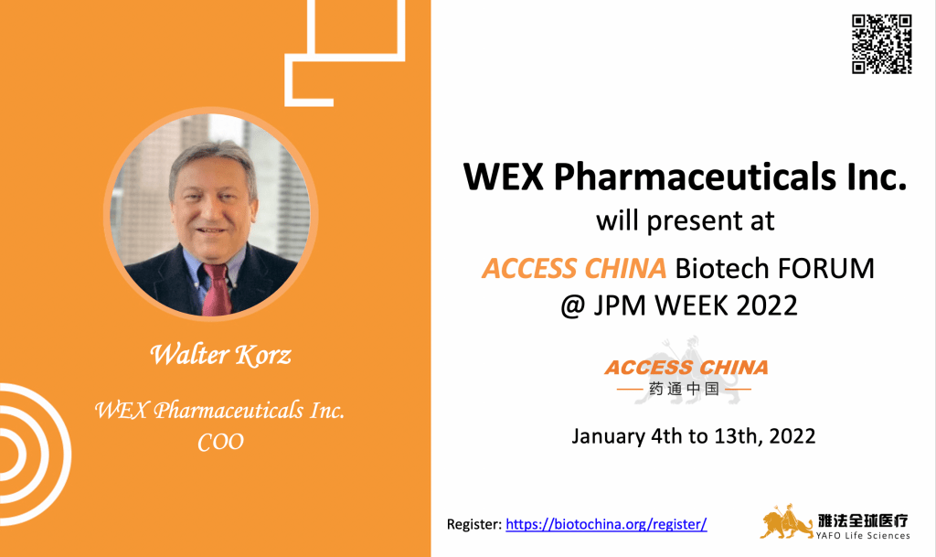 December 26th, 2021 (Shanghai) — We are glad to announce that Walter Korz, the COO of WEX Pharmaceuticals Inc. and Abner Yong, the VP Finance of WEX Pharmaceuticals Inc., have been invited to showcase at ACCESS CHINA Biotech Forum during Jan 4th – Jan13th. ACCESS CHINA Biotech Forum is the largest online corporate access event between China and the western biopharma industry.
