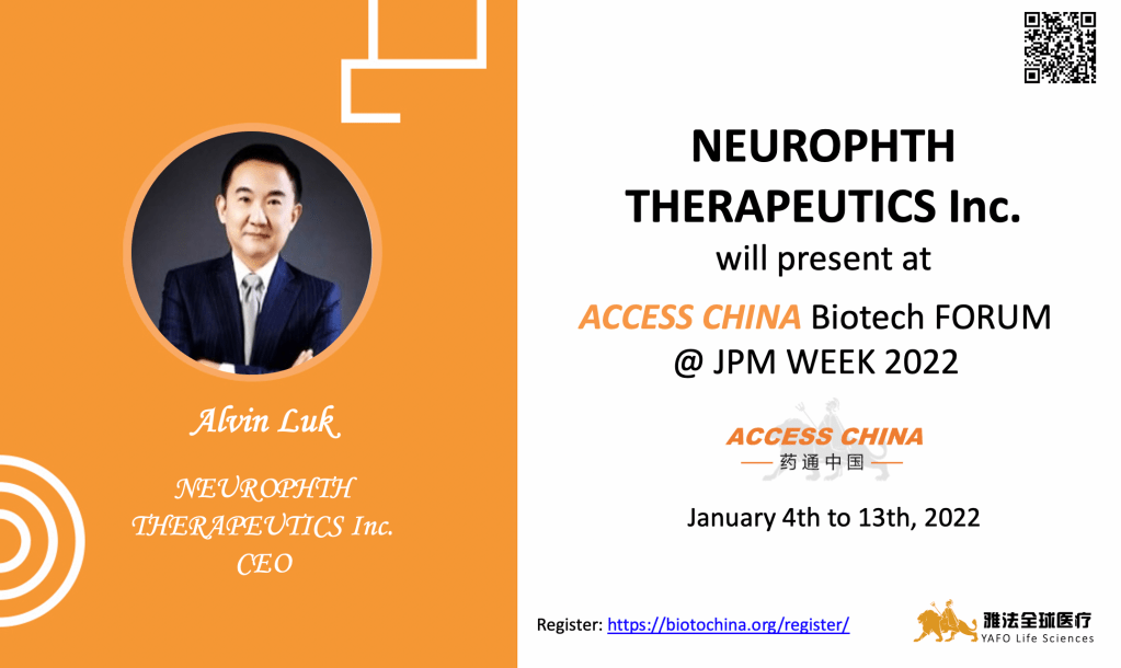 December 27th, 2021 (Shanghai) — We are glad to announce that Alvin Luk, the CEO of NEUROPHTH THERAPEUTICS Inc.(纽福斯生物), has been invited to showcase at ACCESS CHINA Biotech Forum during Jan 4th – Jan13th. ACCESS CHINA Biotech Forum is the largest online corporate access event between China and the western biopharma industry.