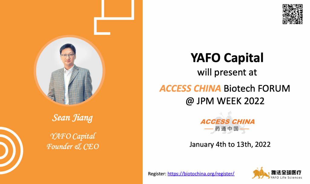 December 27th, 2021 (Shanghai) — We are glad to announce that Sean Jiang, the Founder and CEO of YAFO Capital(雅法资本), has been invited to showcase at ACCESS CHINA Biotech Forum during Jan 4th – Jan13th. ACCESS CHINA Biotech Forum is the largest online corporate access event between China and the western biopharma industry.