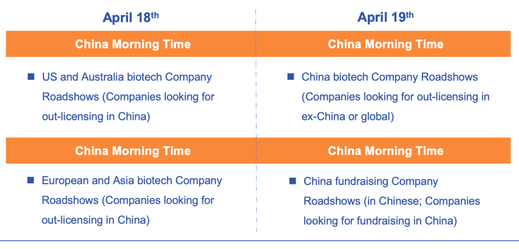 - China biotech Company Roadshows (Companies looking for out-licensing in ex-China or global)
