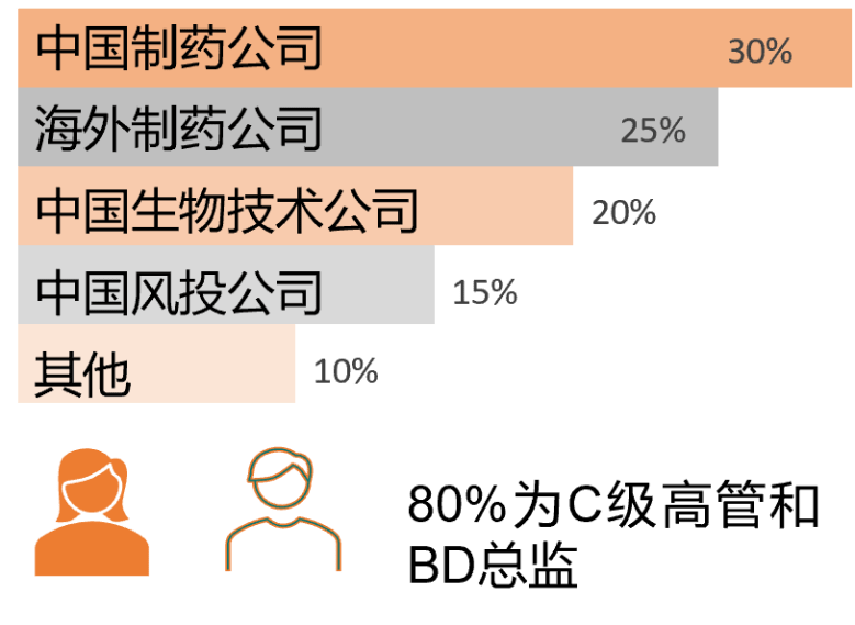 - 国内药企和生物技术公司的BD和高层管理人员:正在寻找全球或国内的产品引进以丰富产品线;或寻求战略投资机会。(50%)