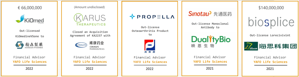 2022年9月26日,翰森制药获得KiOmed Pharma SA(「KiOmed」)的独家许可,在中国大陆、澳门及台湾开发及商业化KiOmedinevsOne用于骨关节炎的治疗。 雅法资本担任本次交易的顾问。