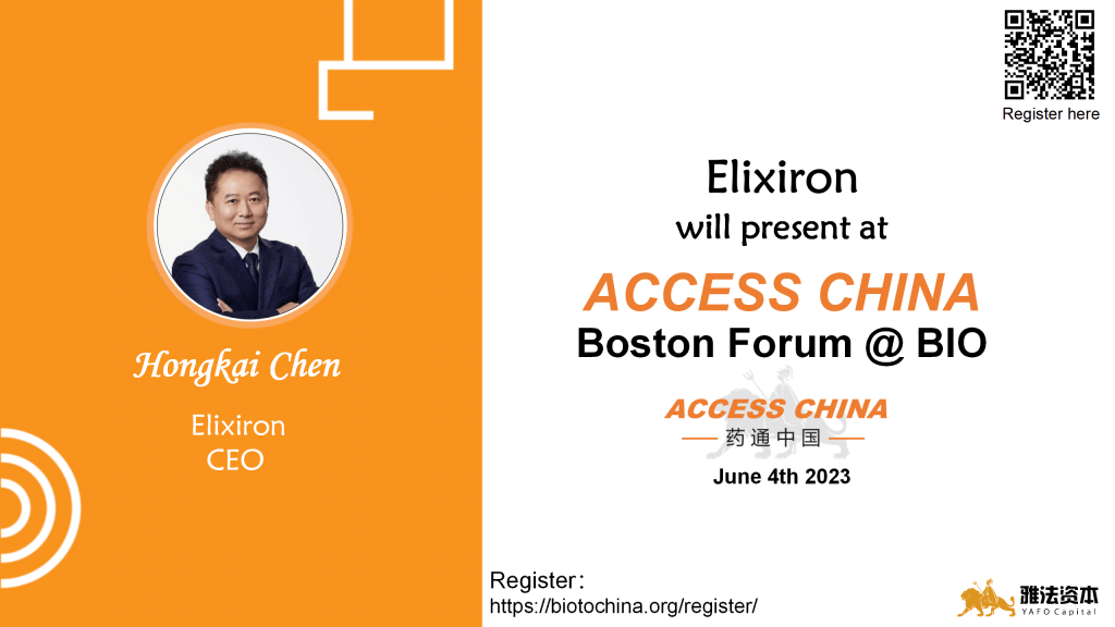 May 26th, 2023 (Shanghai) — We are glad to announce that Dr. Hongkai Chen, the CEO of Elixiron, has been invited to present at ACCESS CHINA Boston Forum on June 4th. ACCESS CHINA Biotech Forum is the largest corporate access event between Asia and the western biopharma industry.