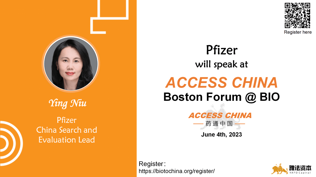 May 22th, 2023 (Shanghai) — We are glad to announce that Dr. Ying Niu, the China Search and Evaluation Lead of Pfizer, has been invited as a keynote speaker at ACCESS CHINA Boston Forum on June 4th. ACCESS CHINA Biotech Forum is the largest corporate access event between Asia and the western biopharma industry.