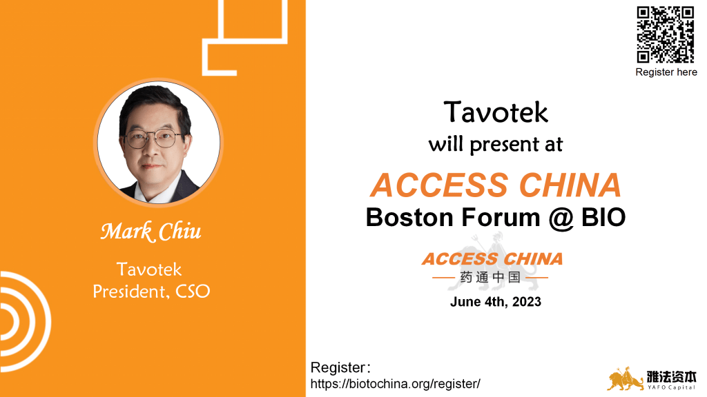 May 16th, 2023 (Shanghai) — We are glad to announce that Mark Chiu, the President & CSO of Tavotek, has been invited to present at ACCESS CHINA Boston Forum on June 4th. ACCESS CHINA Biotech Forum is the largest corporate access event between Asia and the western biopharma industry.