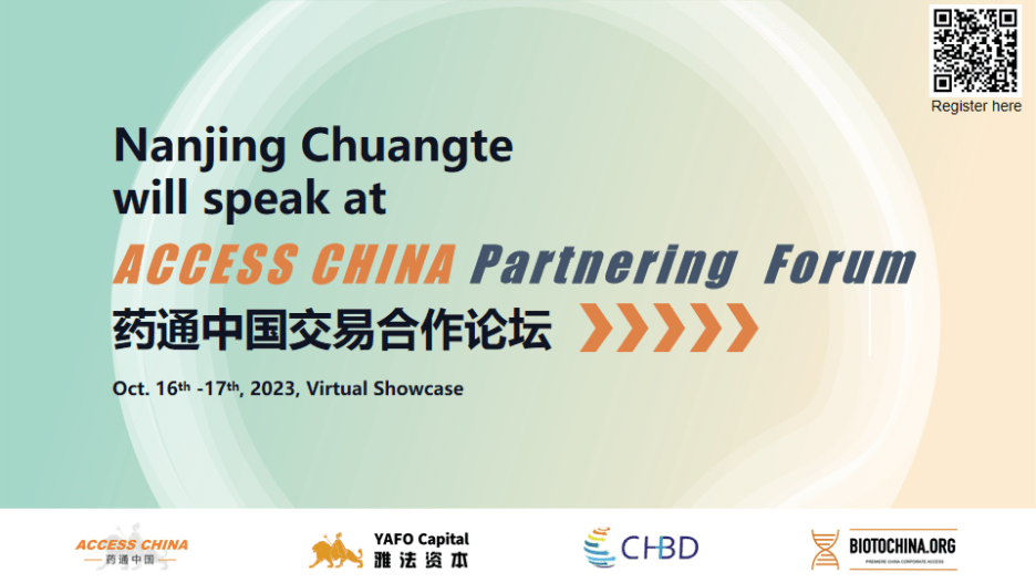 Oct 11th, 2023 (Shanghai) — We are glad to announce that Dr. Yongqiang Zhu, the CEO of Nanjing Chuangte, has been invited to present at ACCESS CHINA Partnering Forum on 15:15-15:30, October 17th, China time.