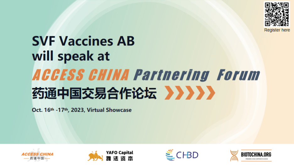 Oct 12th, 2023 (Shanghai) — We are glad to announce that Dr. Richard Bethell, the CEO of SVF Vaccines AB, has been invited to present at ACCESS CHINA Partnering Forum on 15:00-15:15, October 16th, China time.