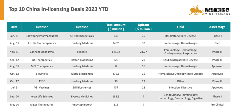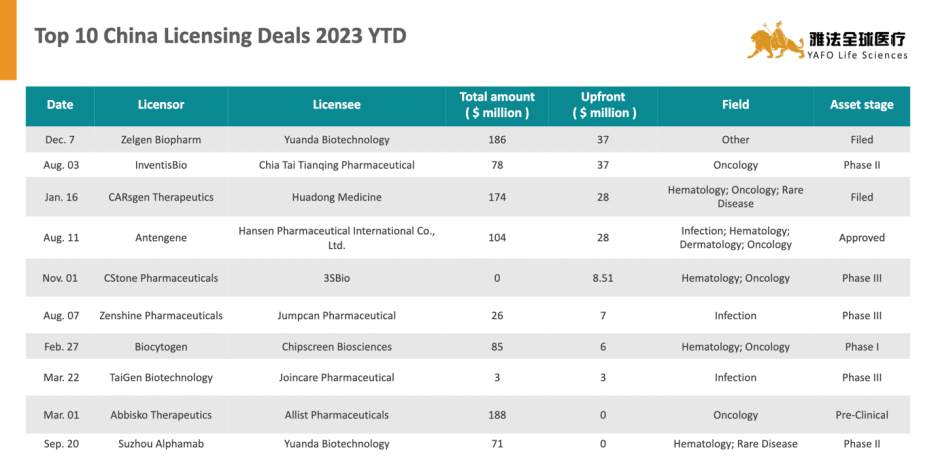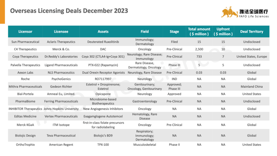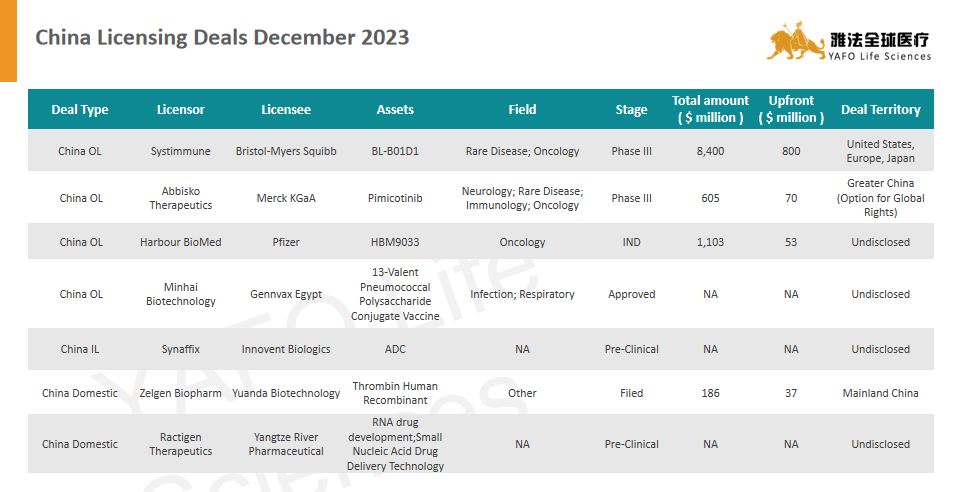 In the first half of December 2023, there are total of 21 Licensing Deals globally including Licensing deals in China. In particular, there are 4 out-licensing deals; 1 in-licensing deal; 2 domestic deals; and 14 overseas deals. The largest deal out-licensing of the year is the deal between Systimmune and Bristol-Myers Squibb amounting $800 million upfront payment including $7.6 billion milestone payment with the total potential consideration of up to $8.4 billion.