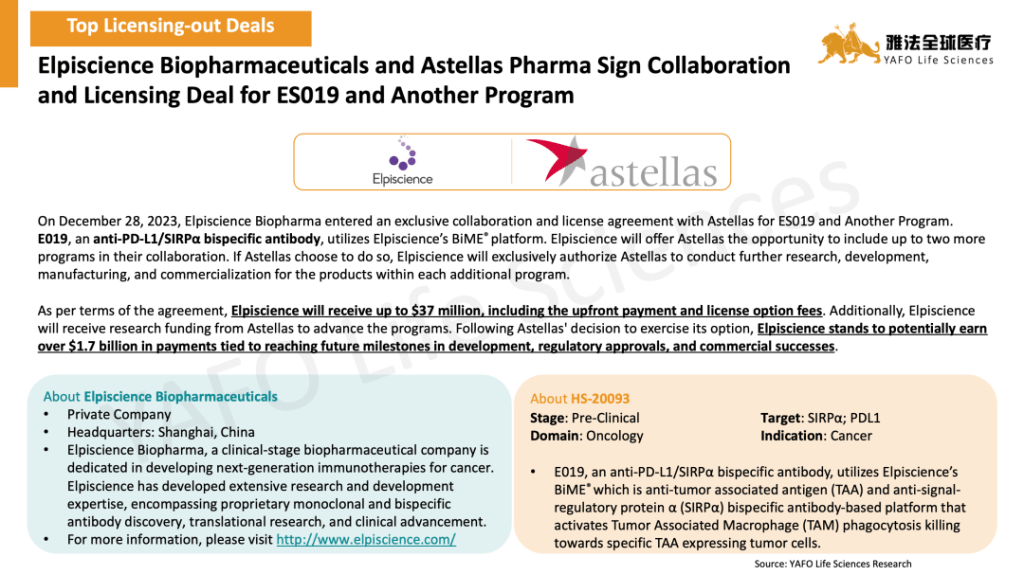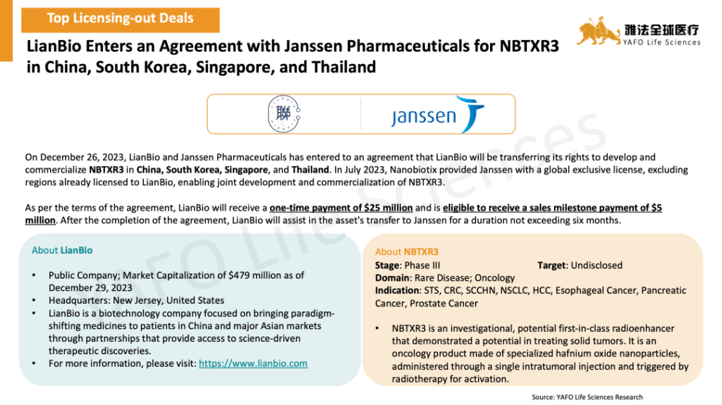 2023年年底12月25日至29日,共有3笔许可协议。具体而言,有2笔出许可协议和1笔海外交易。本周重点关注阿斯利康拟收购亘喜生物,开辟全新的中国生物技术公司发展退出之路——全球并购!该旨在推进阿斯利康在细胞治疗领域的布局来解决癌症和自身免疫性疾病。