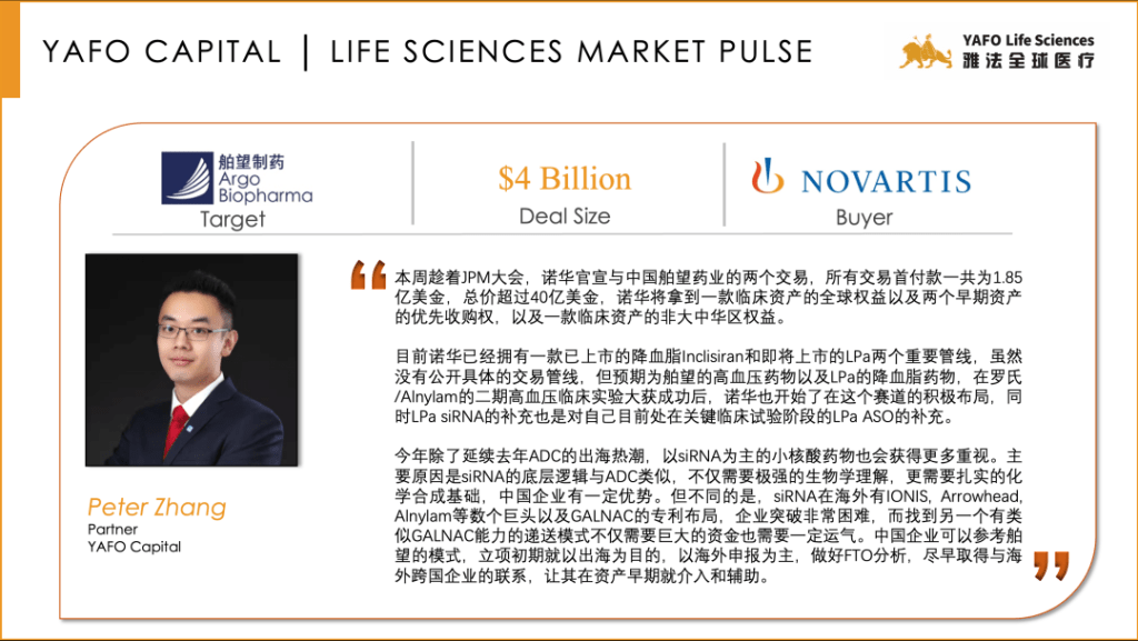 2024年1月第二周,全球共计有25项资产交易。聚焦中国市场,共有2项国内资产授权交易、3项中国出海交易(2项资产授权和1项合作交易。同时,海外市场则有多达20项资产交易,其中11项为资产授权交易,9项为合作交易,反映出全球范围内资产交易的多样化。本周的亮点事件是上海舶望制药与诺华之间价值40亿美元的资产授权交易,因其重磅的交易规模和对行业的潜在影响而备受关注。总体而言,2024年1月第二周是全球资产交易的繁忙时期,多样化的资产授权和合作交易有助于全球医药行业的持续发展。