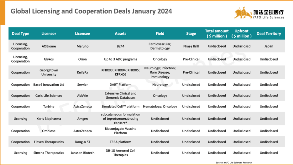 In the second week of January 2024, the global business witnessed a total signing of 25 licensing and cooperation deals. A closer look within the Chinese Market, there were 2 Licensing-in agreements, 2 Licensing-out agreements, and 1 Cooperation Deal. Meanwhile, on the international front, a substantial number of 20 deals materialized, with 11 deals falling under the category of licensing agreements and 9 under cooperation agreements, reflecting a diverse range of collaborative ventures and licensing arrangements on a global scale. The standout event of the week was the $4 billion deal between Shanghai Argo Biopharmaceutical and Novartis, capturing attention for its significant financial magnitude and potential impact on the industry. Overall, the second week of January 2024 proved to be a bustling period for global business collaborations, with diverse partnerships and substantial deals contributing to the ongoing dynamics of the international business landscape.
