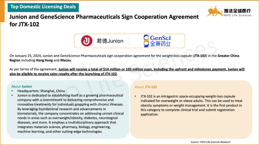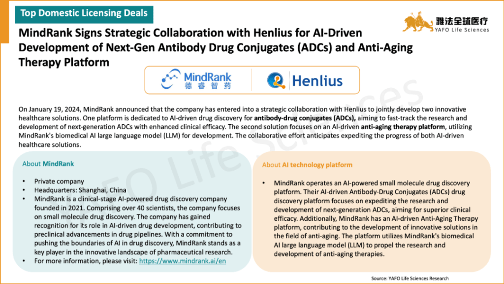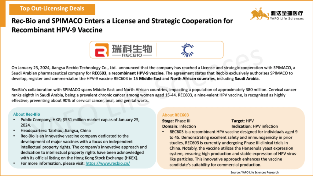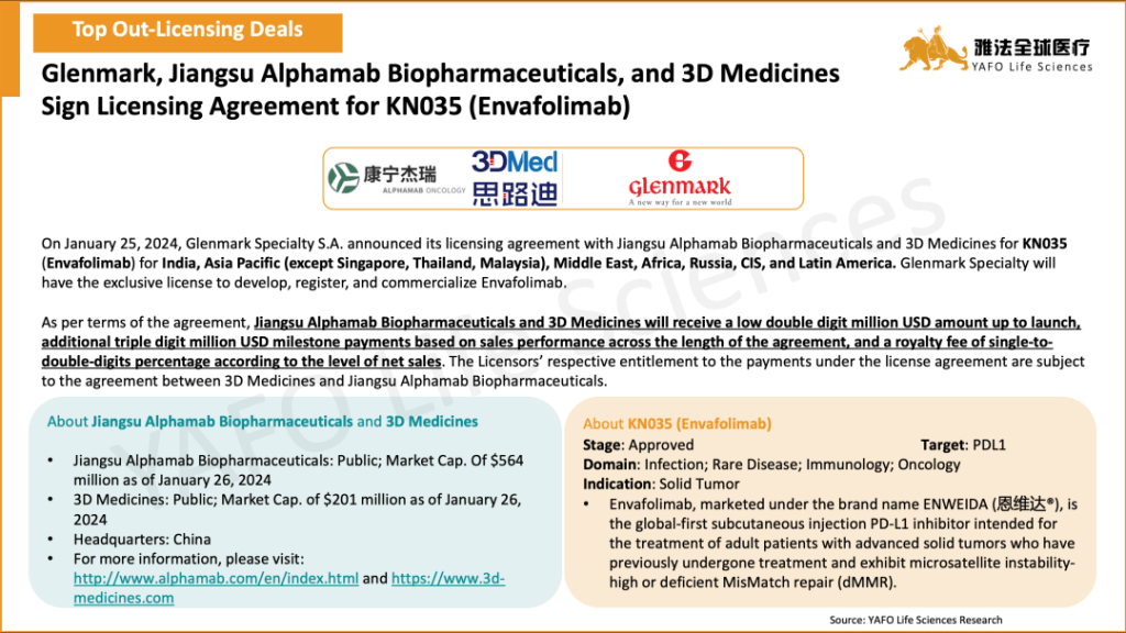 Between January 19 and 26, 2024, a total of 9 licensing and cooperation agreements were successfully signed. Notably, 4 of these agreements were secured within the Chinese Market, while the remaining 5 had a global scope. The standout deal of the week revolves around the licensing agreement involving Glenmark, Jiangsu Alphamab Biopharmaceuticals, and 3D Medicines for KN035 (Envafolimab), amounting a total worth of $701 million.
