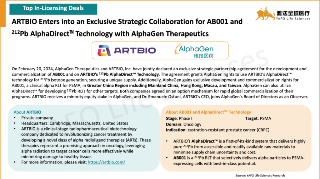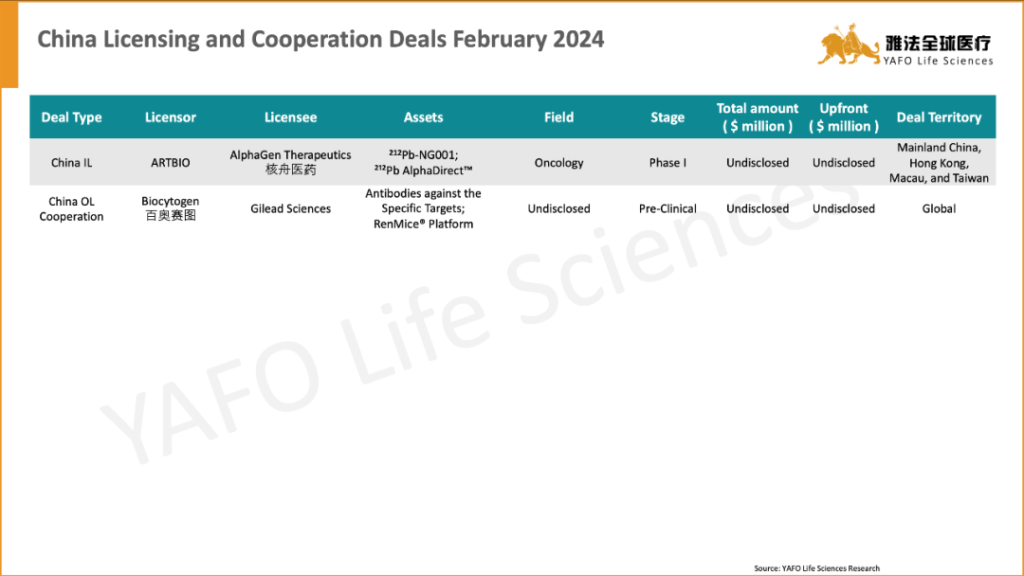 本周没有重要的交易达成。中国市场共有2项资产授权和合作交易。核舟医药获得ARTBIO AB001资产以及 AlphaDirect™核素分离纯化技术在大中华区的权益。百奥赛图与吉利德达成多靶点抗体开发合作和选择协议。全球市场则共有9项资产授权和合作交易。本周最大的交易是Abbvie与Tenarix达成的研发合作交易,针对肿瘤学和免疫学领域开发具有条件控制活性的多特异性生物药,涉及预付款64M美元。