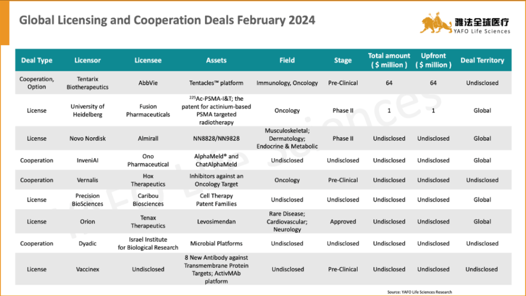 This week, there are no standout agreements made. However, between February 16 and February 23, 2024, 2 licensing and cooperation deals were finalized within the biotech sector in China. ARTBIO and AlphaGen Therapeutics came to an agreement for the in-licensing and collaboration of AB001, as well as ARTBIO’s AlphaDirect™ Technology in the Greater China Region. Additionally, Biocytogen and Gilead Sciences established a Cooperation and Option agreement for the Fully Human Antibody Library. Globally, 9 licensing and cooperation agreements were signed during this period. Leading the week’s deals is the collaboration between AbbVie and Tentarix to Develop Conditionally-Active, Multi-Specific Biologics for Oncology and Immunology, which involves a $64 million upfront payment.