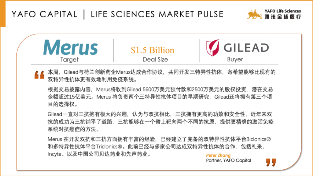2024年3月1日-8日,全球市场共有8项资产授权和合作交易。中国市场仅有1项,海和药物与日本大鹏药品达成资产授权交易,大鹏药品获得海和药物用于治疗非小细胞肺癌的口服小分子MET抑制剂谷美替尼(SCC244)在日本、亚洲(不包括中国)和大洋洲的开发、生产和商业化的独家权利。全球市场则共有7项资产授权和合作交易。本周最大的交易是Gilead与Merus达成的三特异性抗体研发合作交易,涉及预付款56M美元。