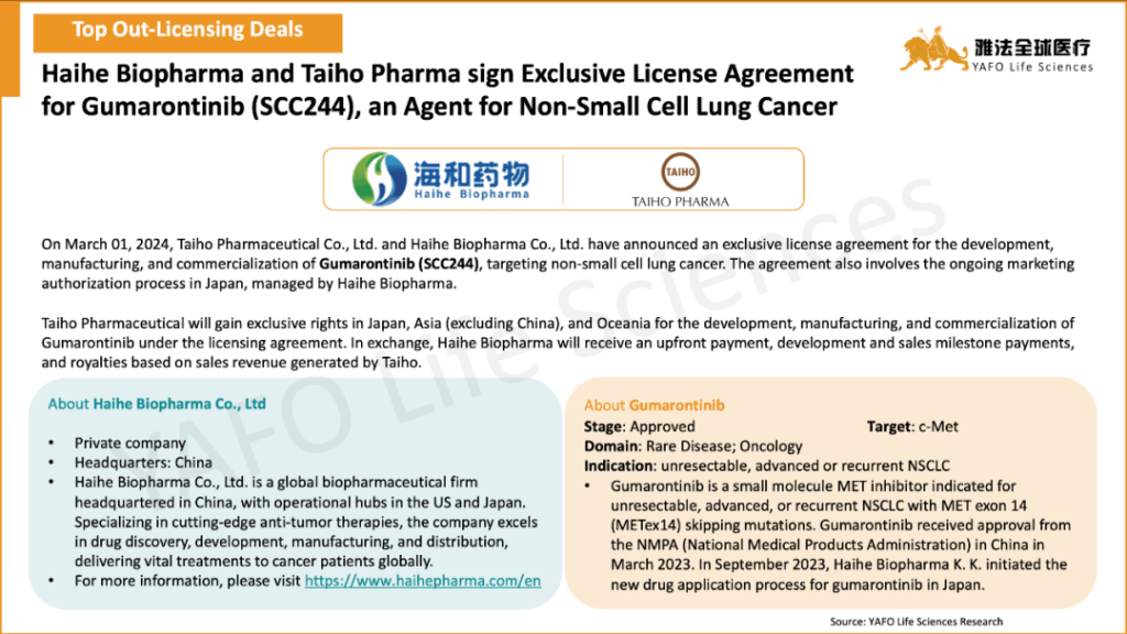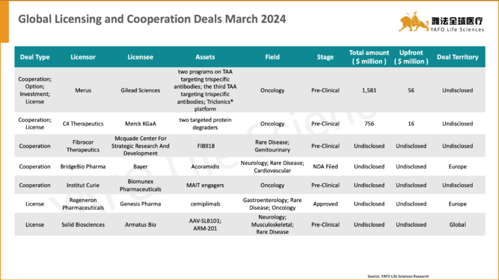 Between March 1st and 8th, 2024, the biotech industry saw a total of 8 agreements for licensing and collaboration. In the Chinese market, HaiheBiopharma and Taiho Pharmaceutical secured the exclusive out-licensing deal in Japan, Asia (excluding China), and Oceania, featuring Gumarontinib (SCC244), an oral MET inhibitor targeting Non-Small Cell Lung Cancer (NSLC). Meanwhile, globally, 7 such agreements were finalized during the same period. Notably, the deal between Merus and Gilead Sciences to develop tri-specific antibodies stood out, boasting an upfront payment of $56 million.