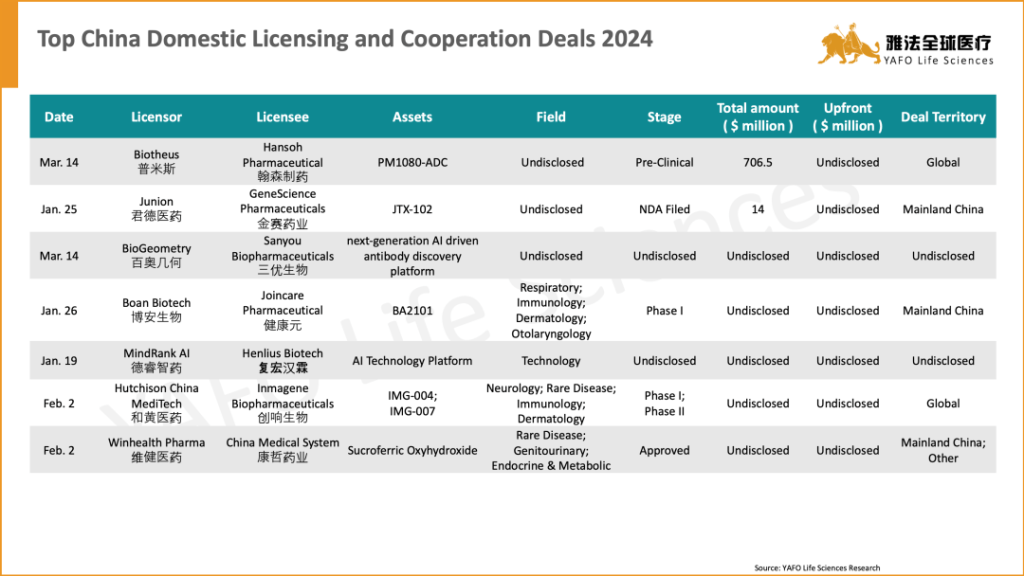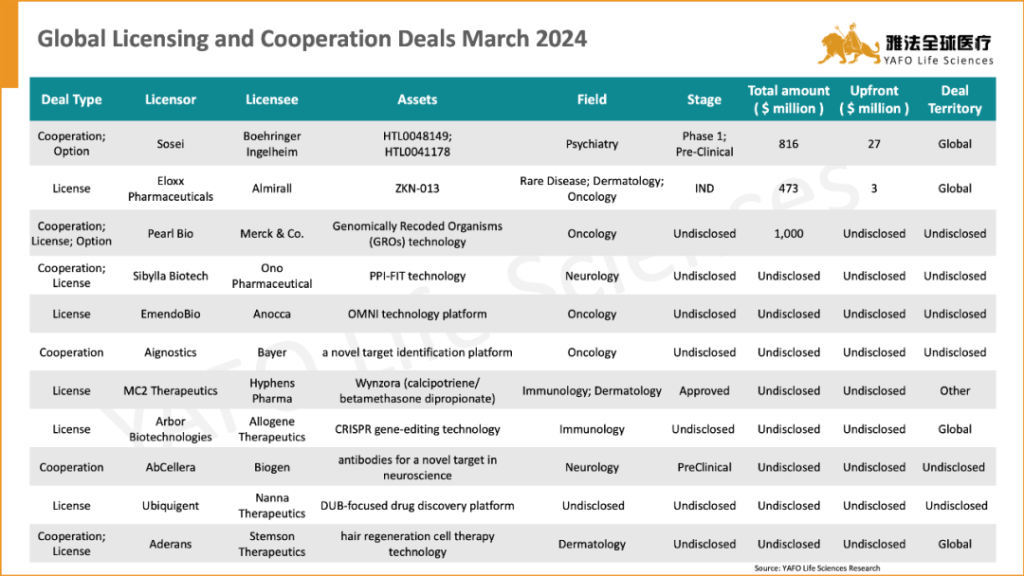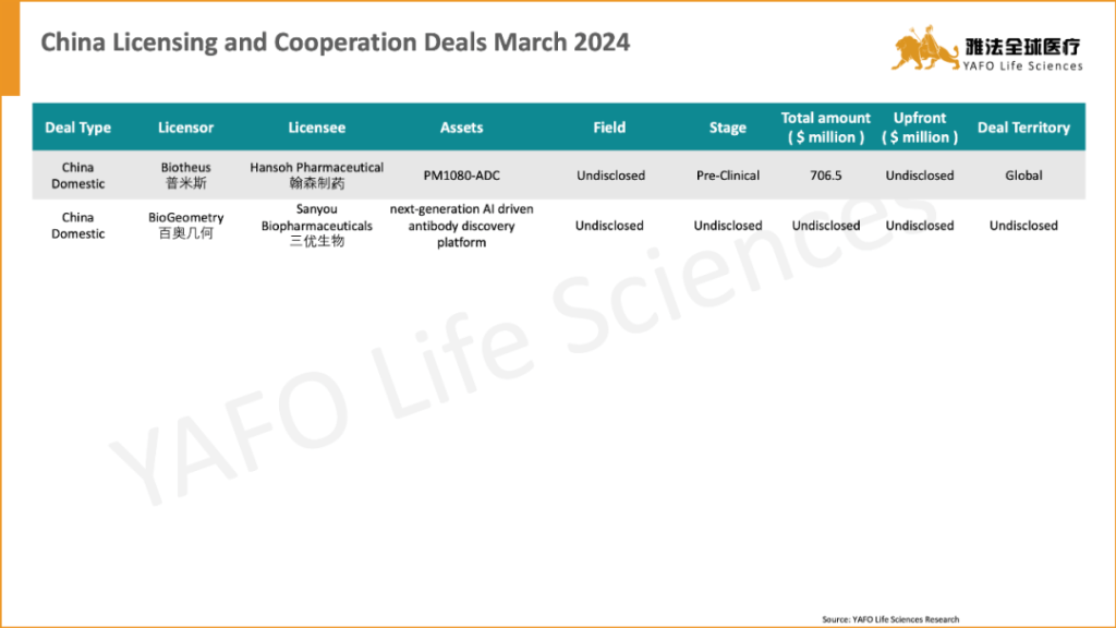 From March 9 to 15, a total of 13 licensing and cooperation agreements were signed globally. In the China Biotech Industry, 2 licensing and cooperation deals were sealed. The licensing and cooperation deal between Biotheus and Hansoh Pharmaceutical tops this week with a total deal amount of $706.5 million for the PM1080-ADC, which is in the pre-clinical stage. As of March 15, this deal has the highest total deal amount for 2024 China Domestic Licensing transactions. Meanwhile, in the global setting, the cooperation agreement between Sosei and Boehringer Ingelheim tops this week with an upfront payment of $27 million and a total amount of $816.5 million for 2 assets, the HTL0048149 and HTL0041178.