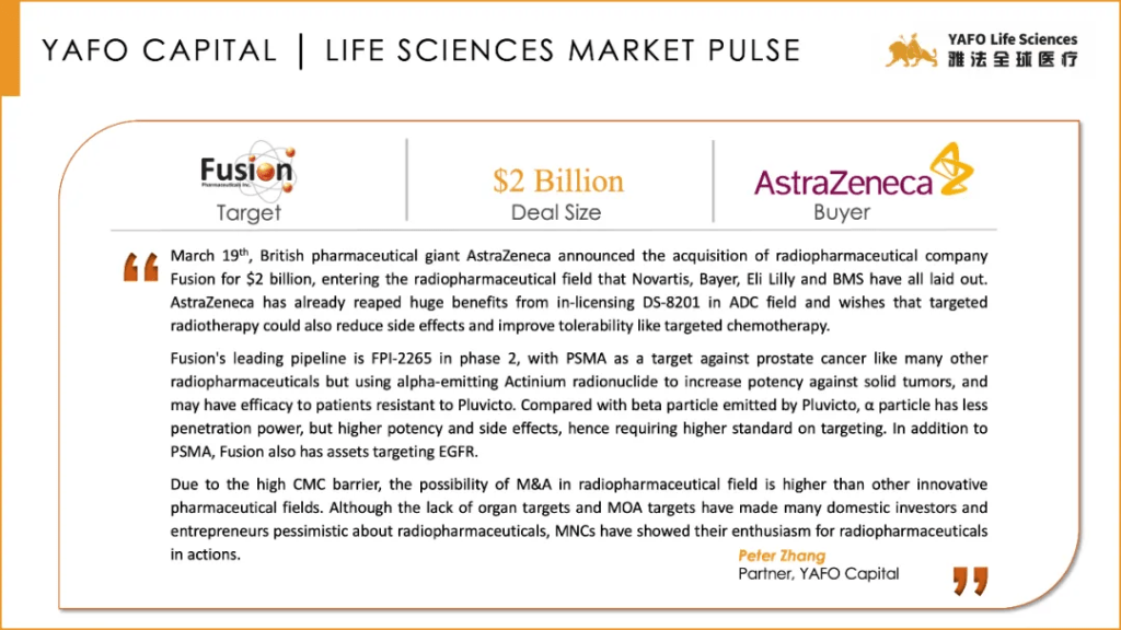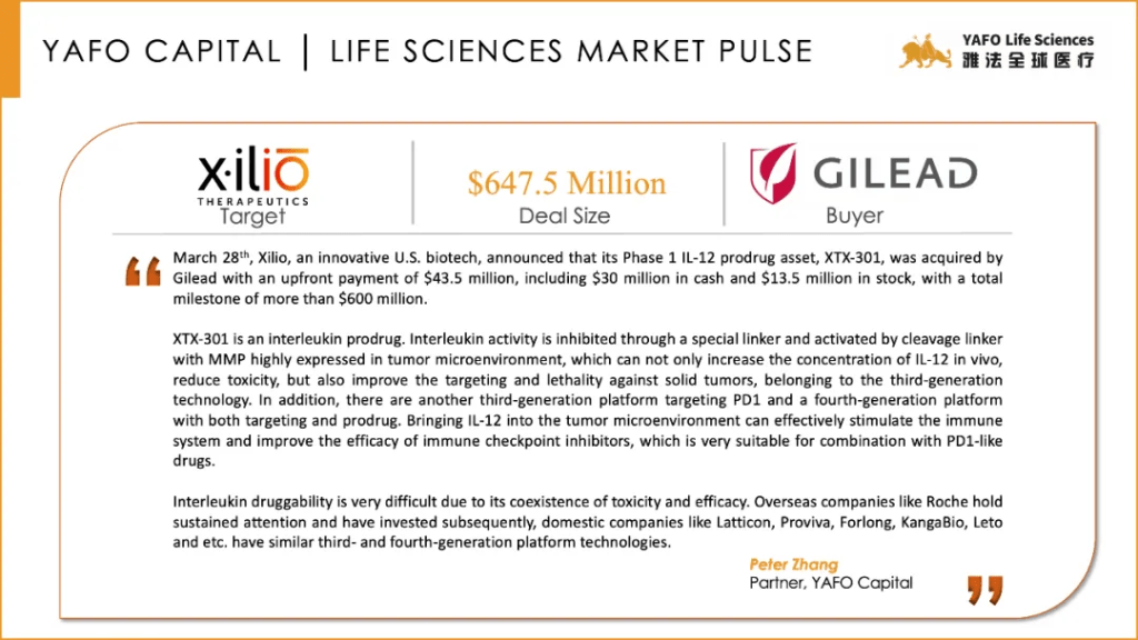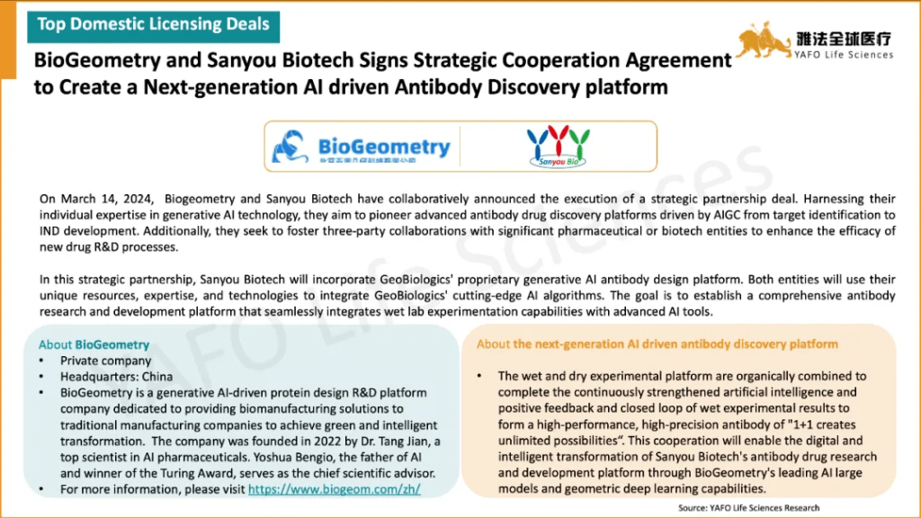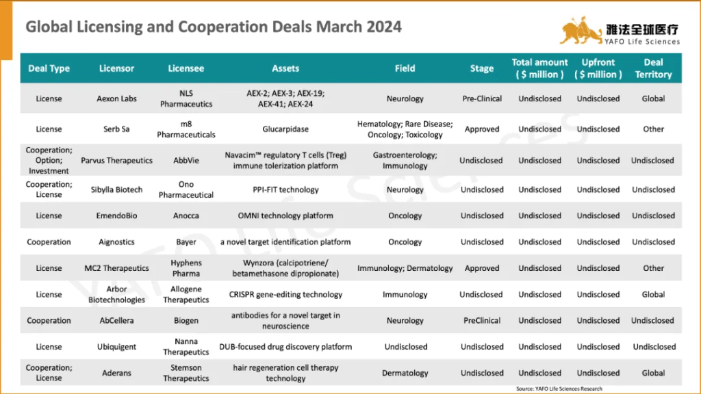 在全球范围内,3月份签署了32项资产授权和合作协议。最大的一笔交易是AriBio与一家未披露名字的公司达成的交易,预付款为9000万美元,总价值为7.7亿美元。