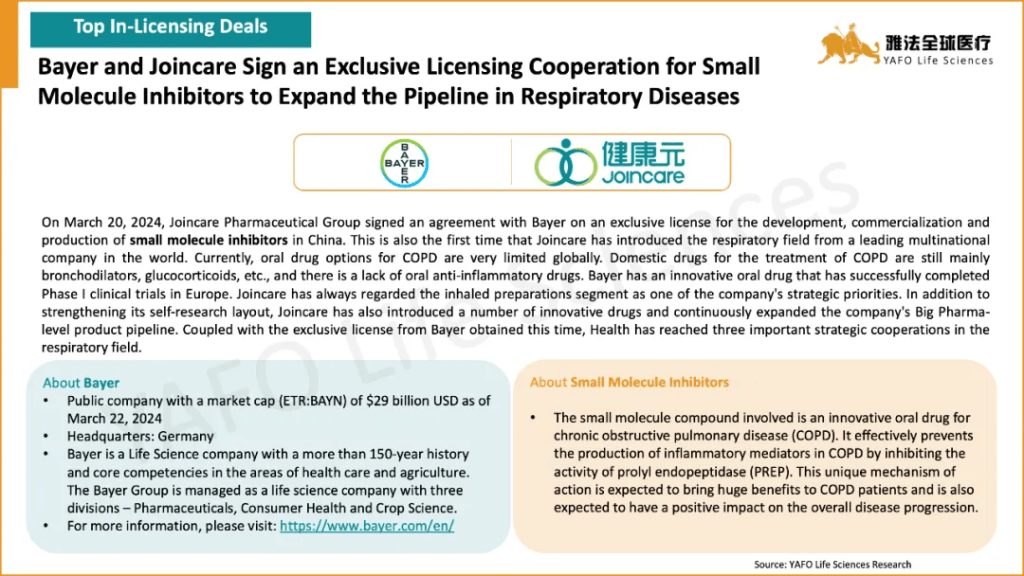 In March, there were a total of 40 licensing and cooperation deals signed, marking a slight decrease compared to February. Within China pharma market, 8 deals were sealed, comprising 4 out-licensing deals, 3 domestic deals and 1 in-licensing deal. The most significant deal of the month in China market was between Biotheus and Hansoh Pharmaceutical, with a total deal value of $706.5 million.