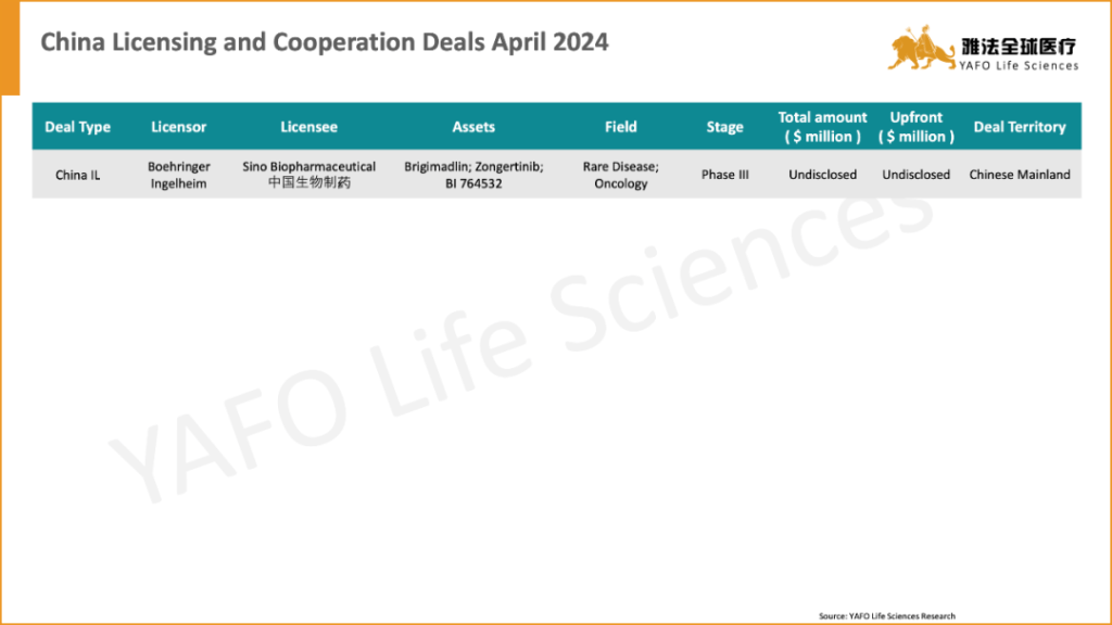 From April 8 to 12, a total of four licensing and cooperation agreements were sealed. Within the China Biotech Industry, only one in-licensing deal was signed, involving Boehringer Ingelheim and Sino Biopharmaceutical. Globally, three licensing and cooperation deals were inked during this period. The most significant deal of the week was between Arvinas and Novartis, boasting an upfront payment of $150 million and a total deal value amounting to $1,160 million.