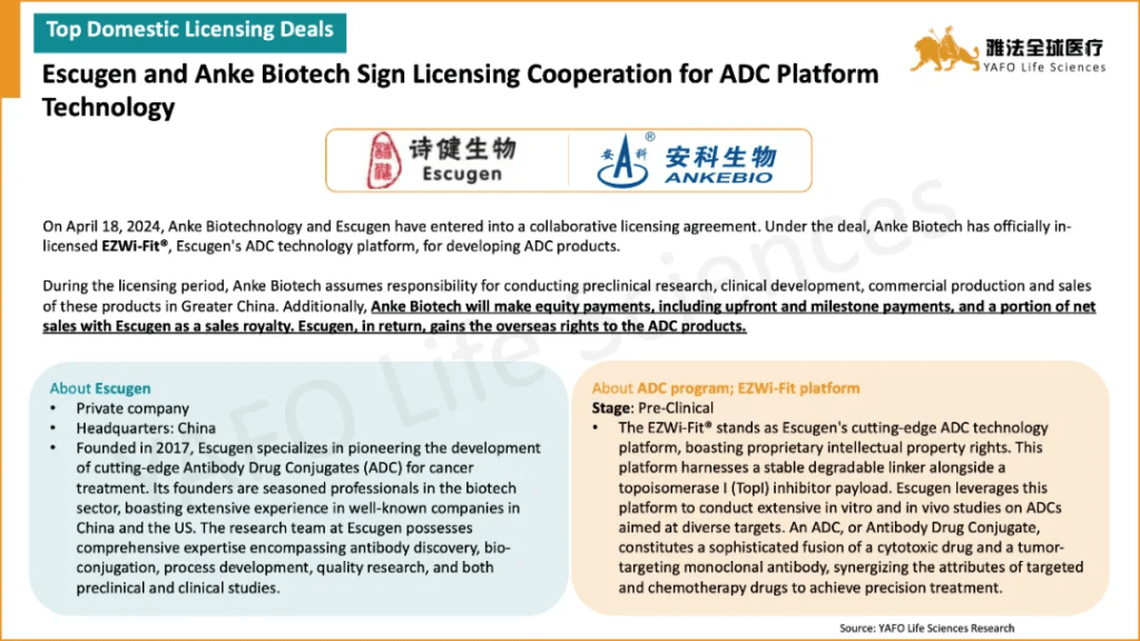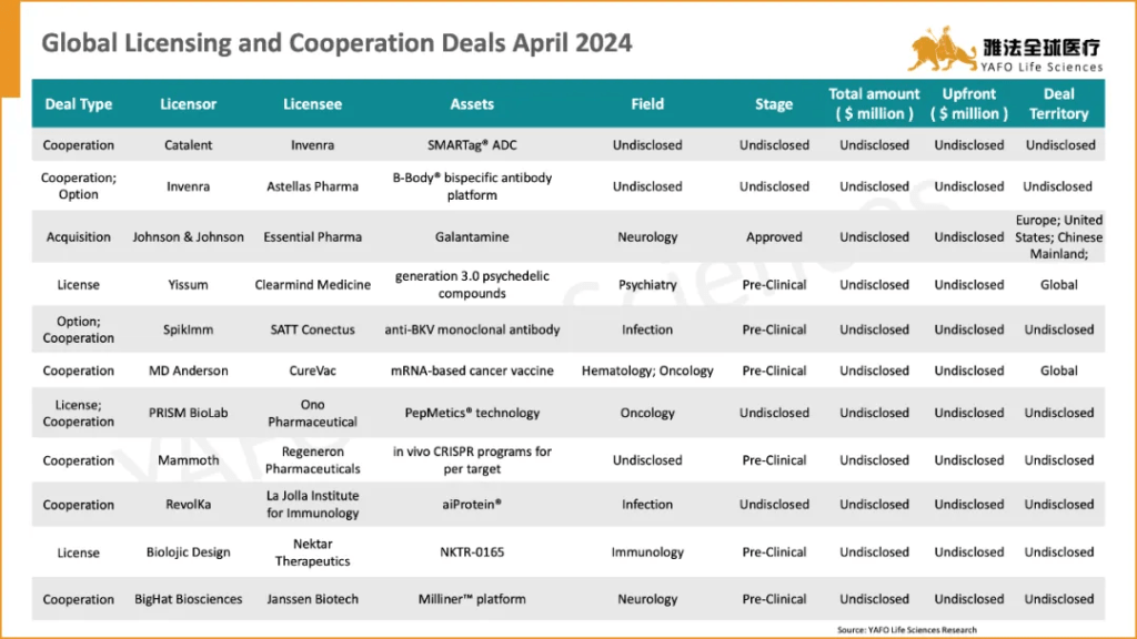 On the global scale, there were a total of 21 global licensing and cooperation deals signed in April. The most prominent global deal was the deal between Arvinas and Novartis for Luxdegalutamide and AR-V7 PROTAC with a total deal value of $1,160 million and an upfront payment of $150 million.