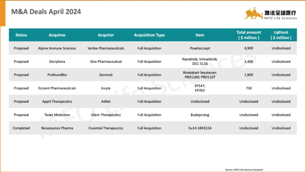 4月10日,美国Vertex Pharmaceuticals宣布以50亿美元现金收购Alpine Immune, 一家处于临床阶段的自免疾病领域生物技术公司, 交易溢价超过66%。