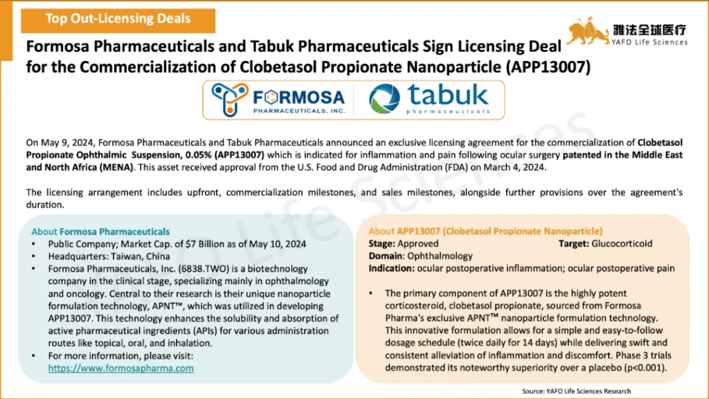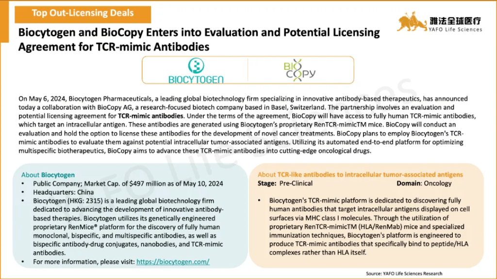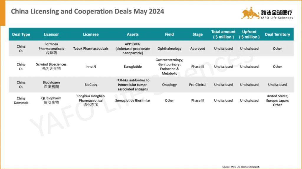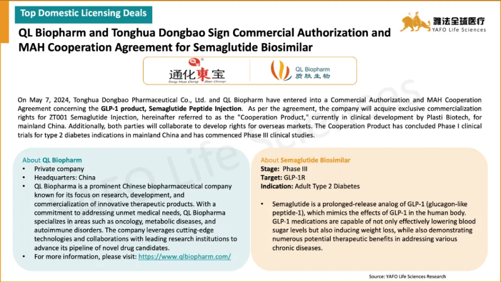 From May 1 to May 10, a total of 18 licensing and cooperation deals were signed globally. Specifically, in the China Biotech Industry, there were 3 out-licensing deals and 1 domestic deal, while two of them are related with GLP-1 agonists. Sciwind Biosciences and inno.N signed a cooperation and licensing deal for Ecnoglutide. And, domestically, QL Biopharm and Tonghua DongbaoPharmaceutical sealed a licensing and cooperation agreement for SemaglutideBiosimilar.