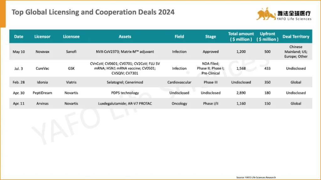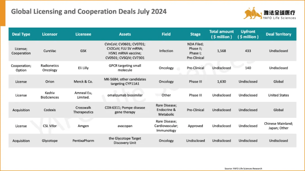 国际市场上,7月份的首周共签署了7项资产授权与合作交易。其中最值得关注的交易是GSK与CureVac之间就后者的多项疫苗资产达成合作,首付款4.33亿美元,总金额15.68亿美元。
