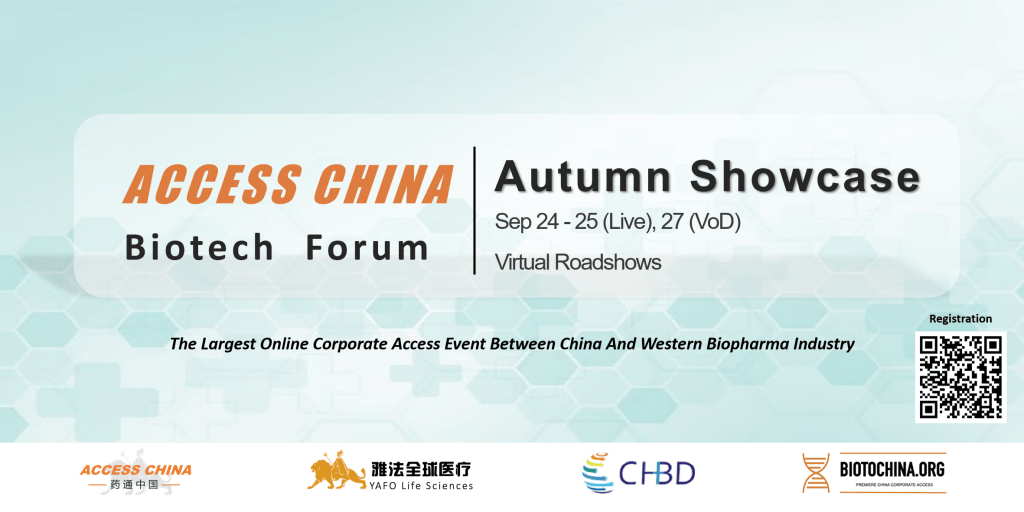 We are honored to invite you to join our “ACCESS CHINA Partnering Forum – Autumn Virtual Showcase” on Sep 24 – 25 (live), and 27 (VoD) 2024. ACCESS CHINA Partnering Forum helps biotechs/pharmas efficiently present their assets in front of 500+ healthcare companies and VCs online. During the event, the audience can have access to innovative pharma and healthcare products from worldwide. We look forward to welcoming you to our Autumn event in October!