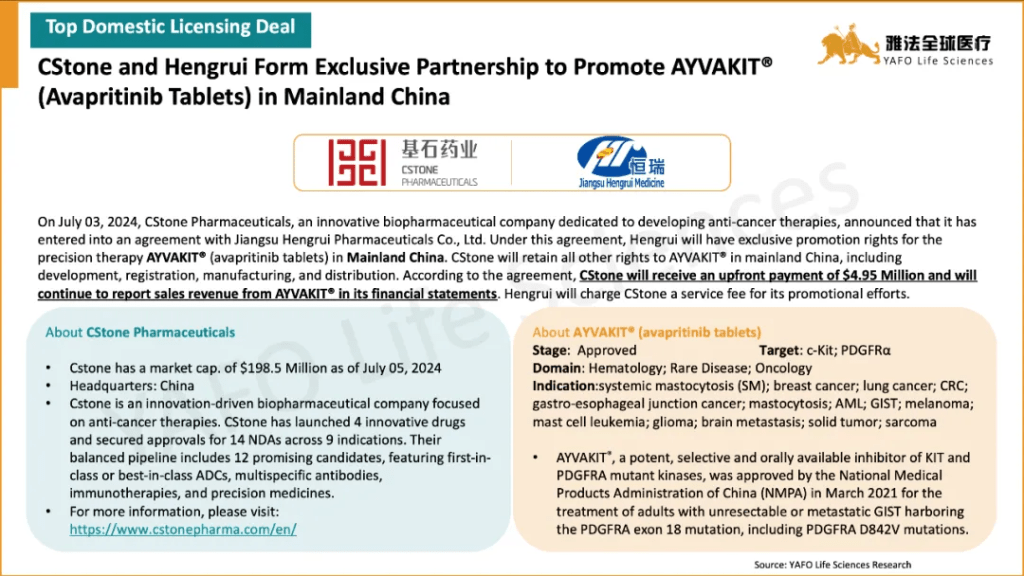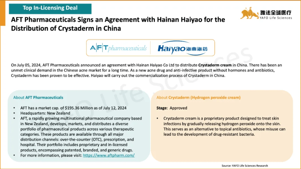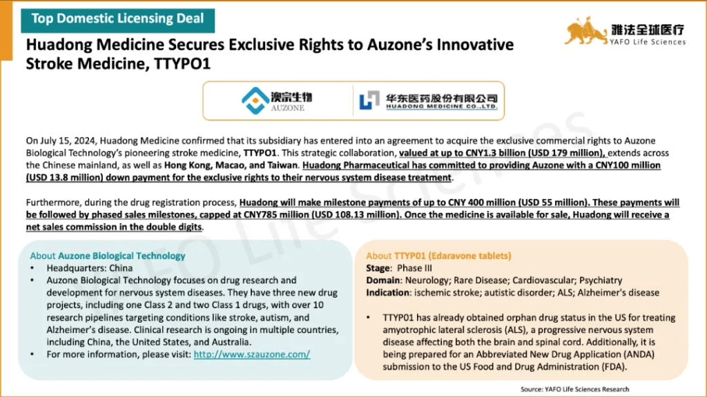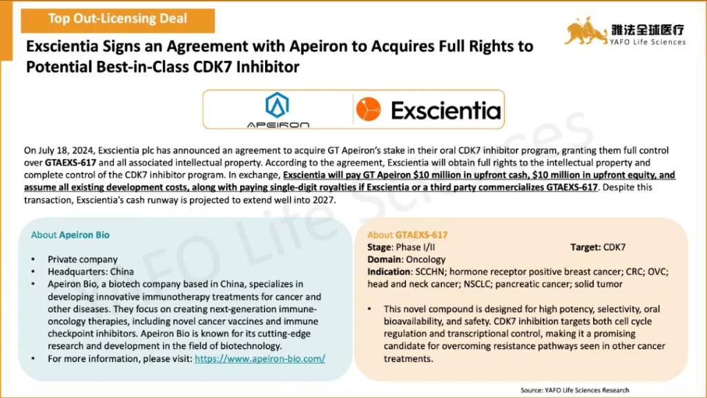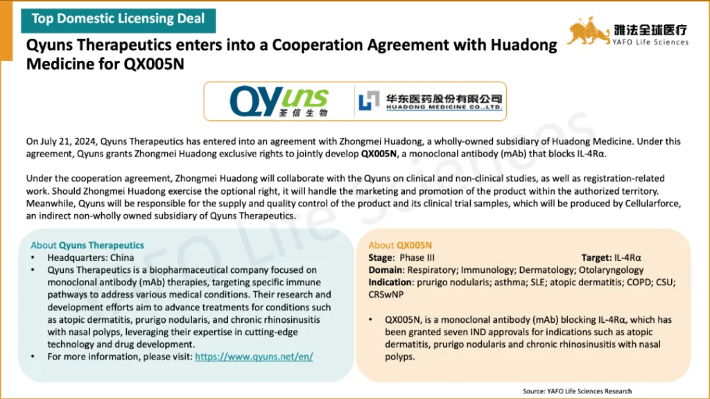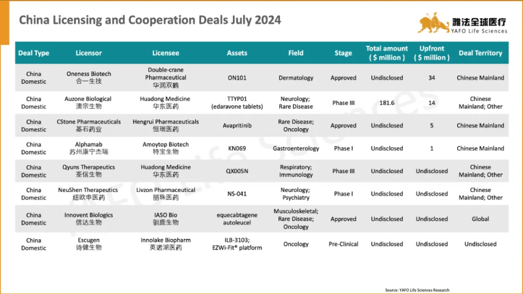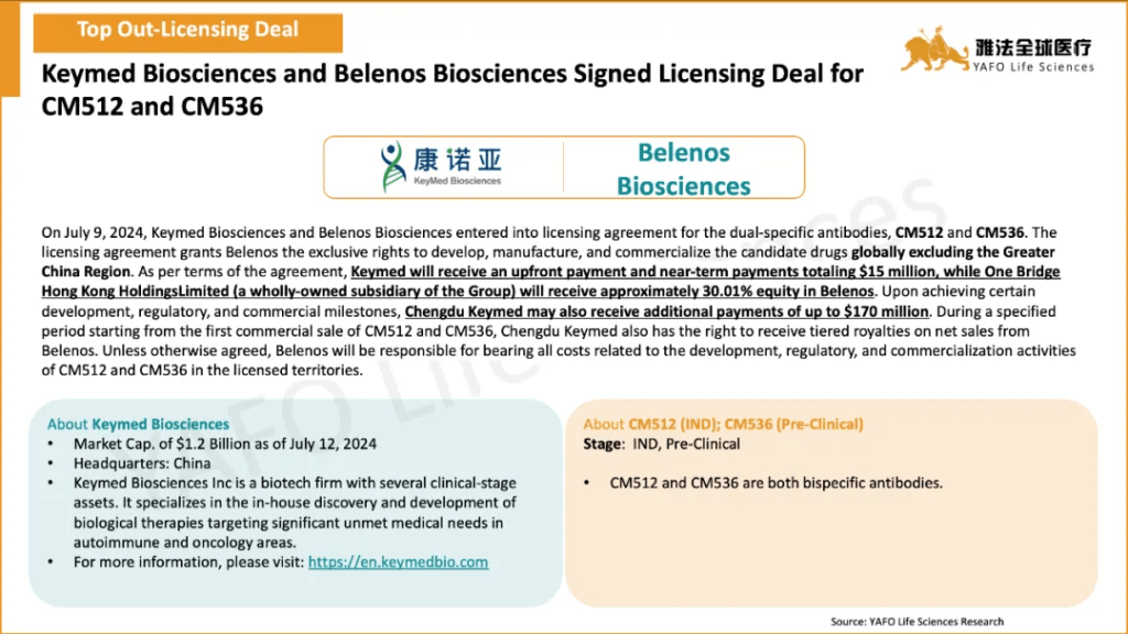 The standout out-licensing deal of the month was between Keymed Biosciences and Belenos Biosciences for the pre-clinical assets CM512 and CM536, totaling $185 million with an upfront payment of $15 million. The highlight domestic deal was the licensing agreement between Oneness Biotech and Double-crane Pharmaceutical for the approved asset ON101, featuring an upfront payment of $34 million.