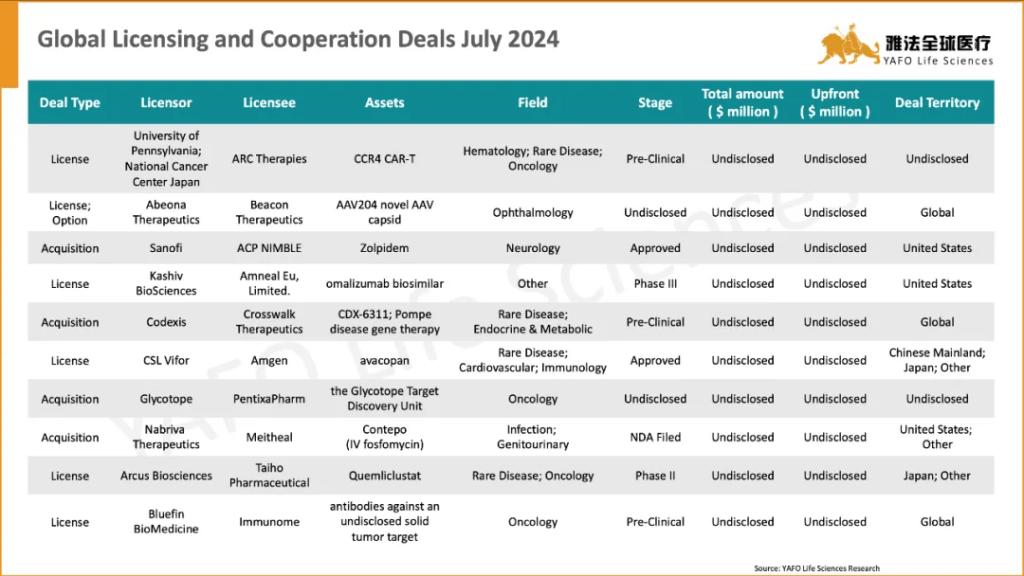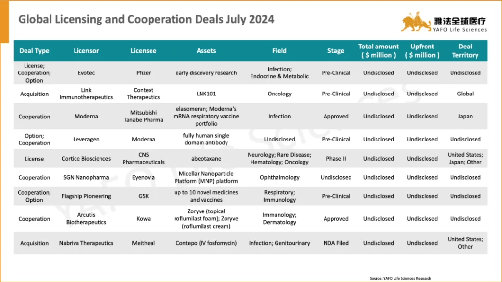 In July, a total of 60 licensing and cooperation deals were signed globally. Within the China Biotech Industry, 22 deals were signed, including 12 out-licensing deals, 2 in-licensing deals, and 8 domestic deals.
