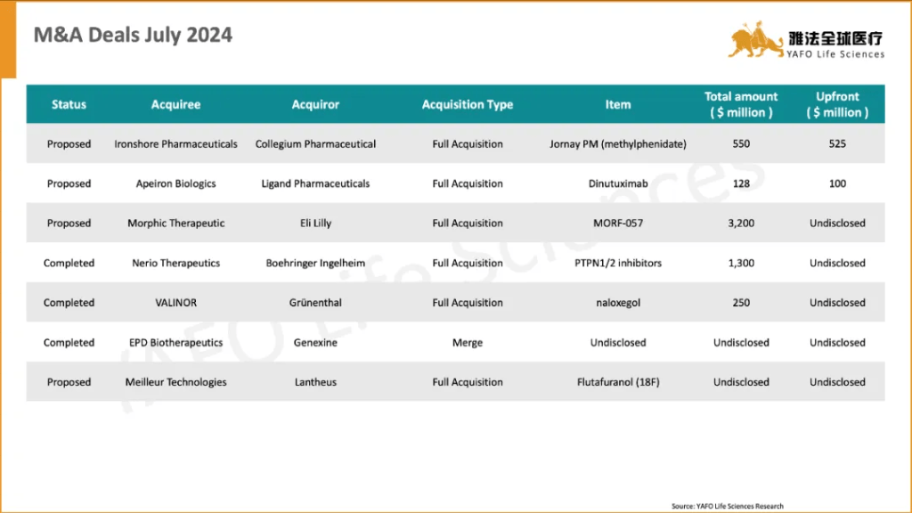 2024年7月,全球医药市场共签署了60项资产授权和合作协议。其中,中国医药市场达成22项交易,包括12项出海交易、8项国内交易和2项引进交易。