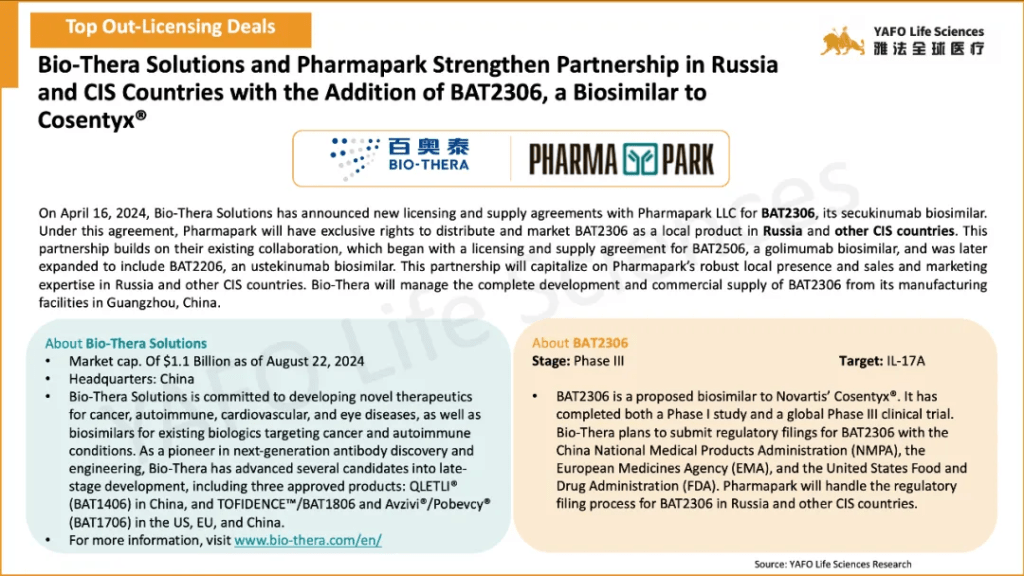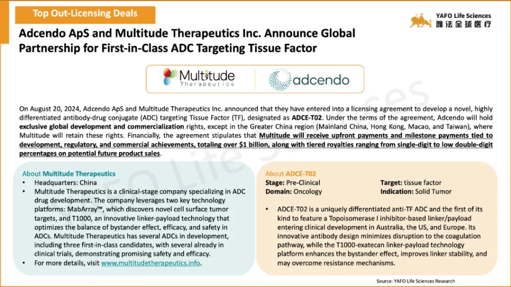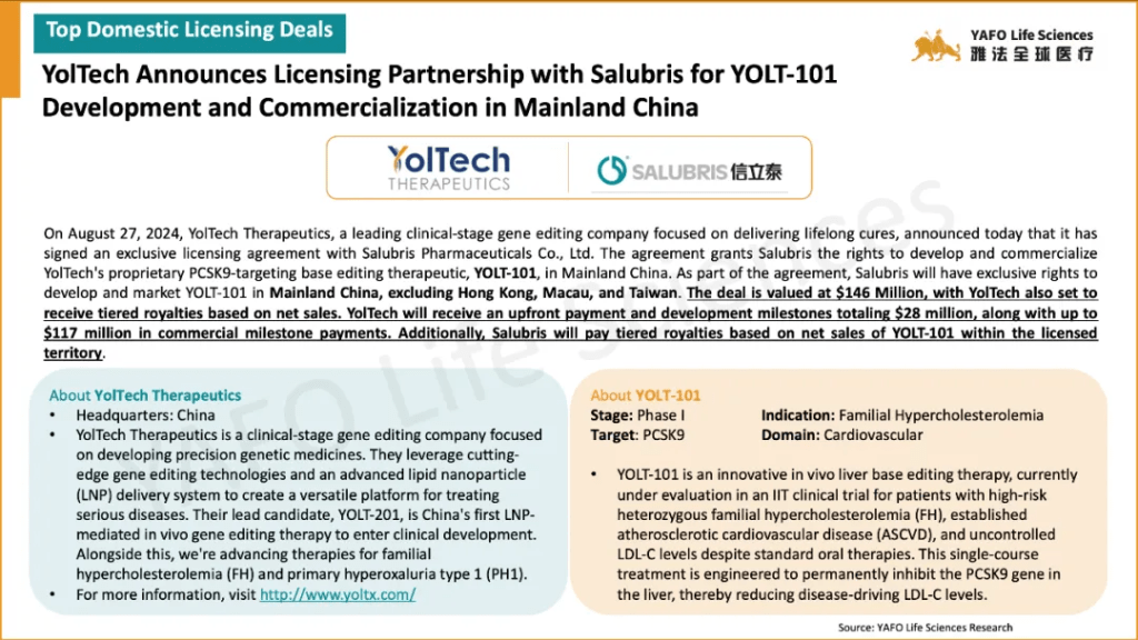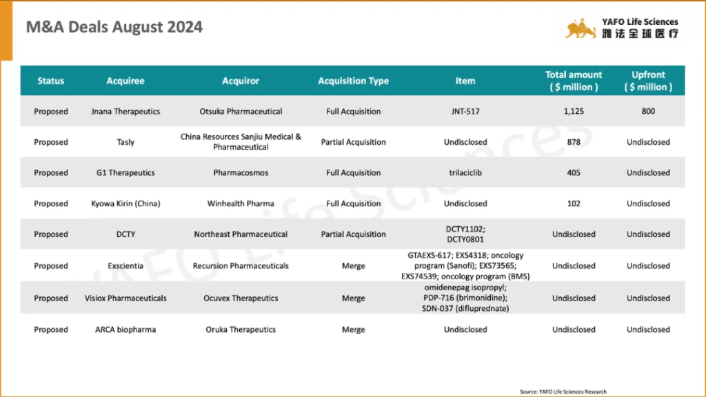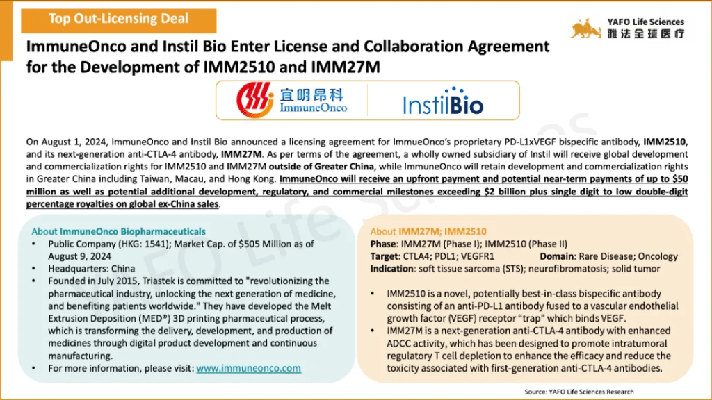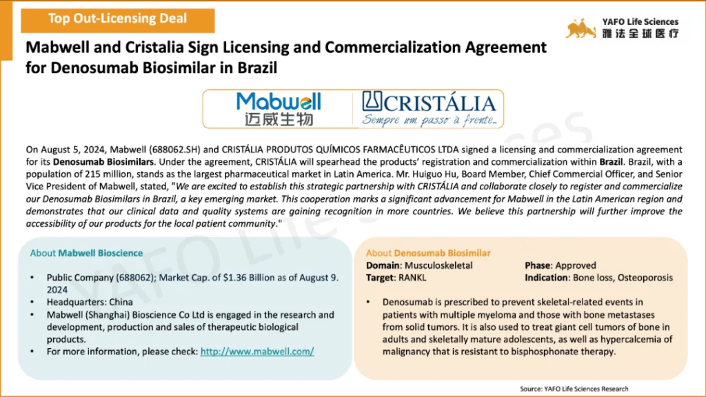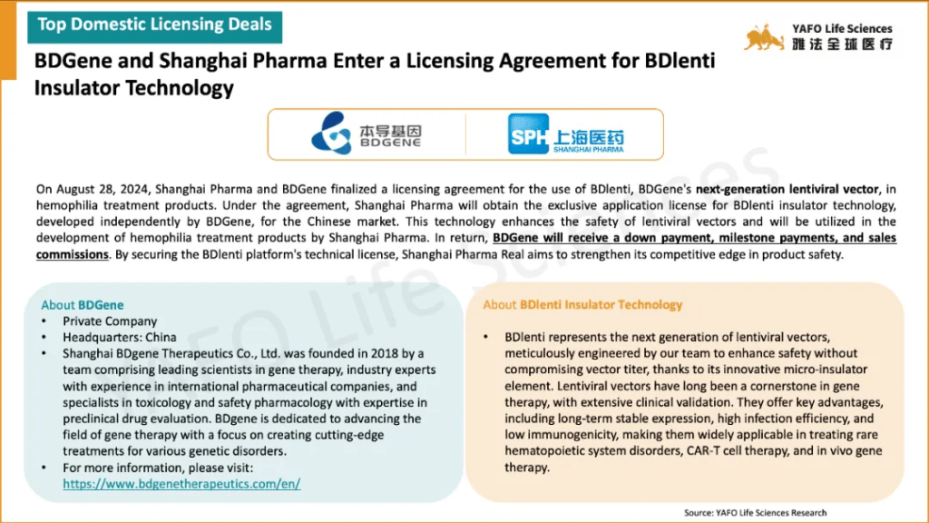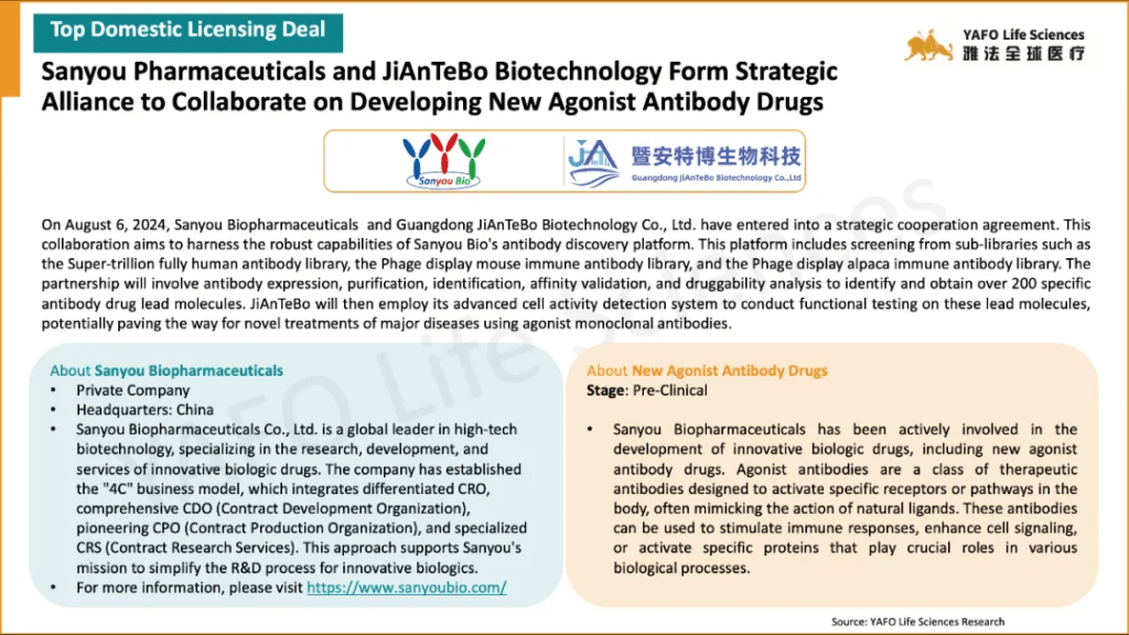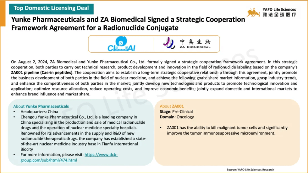 In August, a total of 47 licensing and cooperation deals were signed globally. Within the China Biotech Industry, 24 deals were signed, including 11 out-licensing deals, 3 in-licensing deals, and 10 domestic deals.