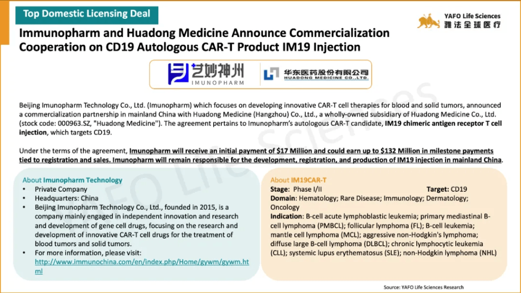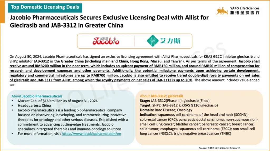 Notably, the top out-licensing deal of the month was between Curon Biopharmaceutical and Merck & Co., involving the Phase I/II asset CN201. This high-profile agreement is valued at $1.3 billion, with an upfront payment of $700 million. The most prominent in-licensing deal was the $316 million deal between Imbiologics and Huadong Medicine for IMB-101 and IMB-102, which included an upfront payment of $6 million. The standout domestic deal was between Jacobio Pharmaceuticals and Allist Pharmaceuticals for the licensing of JAB-3312 and glecirasib, valued at $118 million with an upfront payment of $21 million.