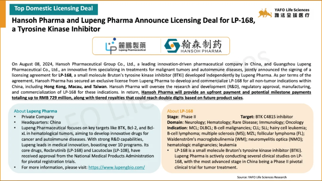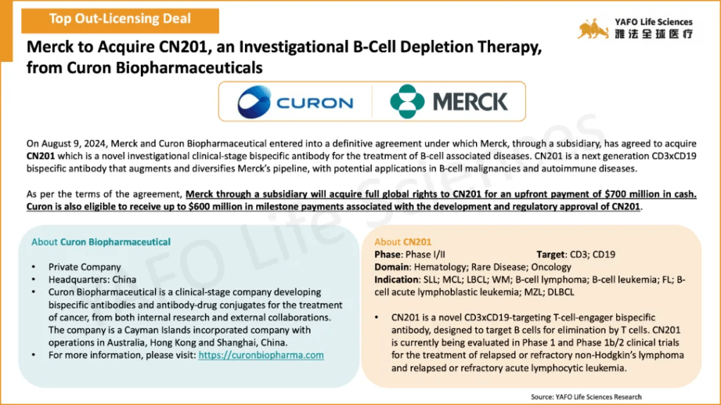 On a global scale, 23 licensing and cooperation deals were concluded. Among these, the agreement between Merck & Co. and Daiichi Sankyo for HPN823 was notable, featuring an upfront payment of $170 million.