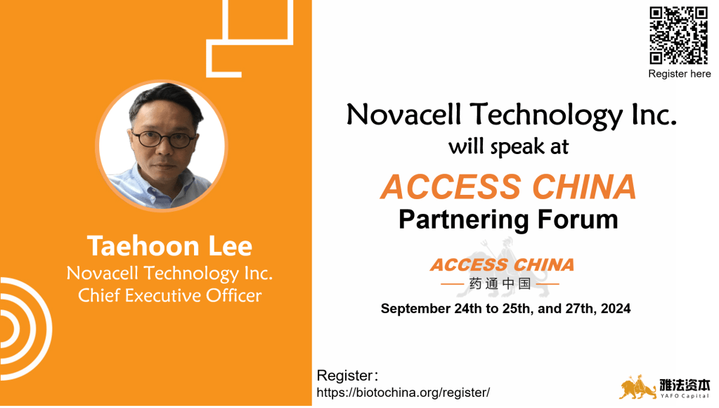 September 10th, 2024 (Shanghai) — We are glad to announce that Taehoon Lee, the Chief Executive Officer of Novacell Technology Inc., will be presenting at the ACCESS CHINA Partnering Forum – Autumn Virtual Showcase during September 24th to 25th, and 27th, 2024. ACCESS CHINA Biotech Forum is the largest corporate access event between Asia and the western biopharma industry.