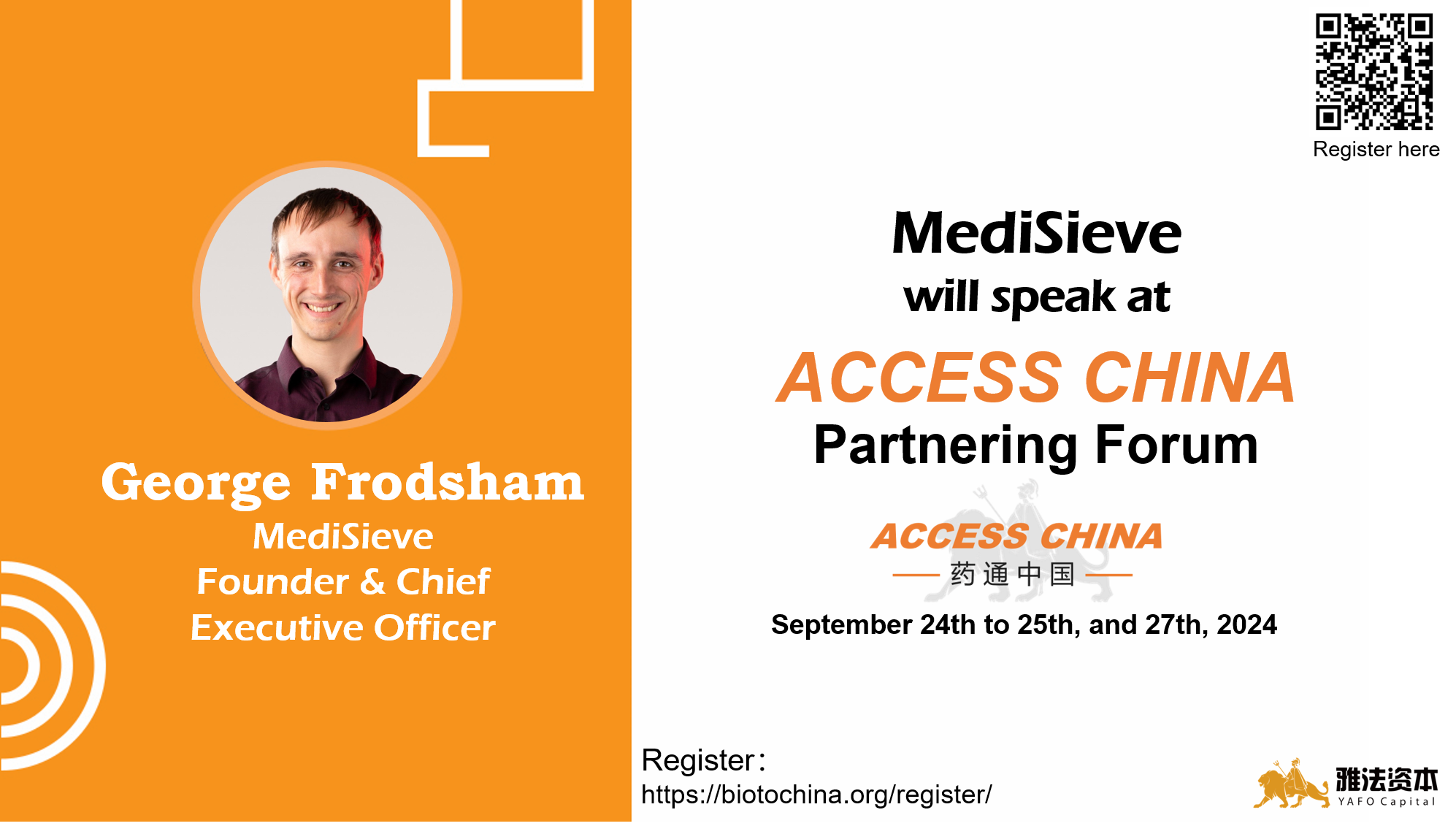 September 23rd, 2024 (Shanghai) — We are glad to announce that Dr. George Frodsham, the Founder & Chief Executive Officer of MediSieve, will be presenting at the ACCESS CHINA Partnering Forum – Autumn Virtual Showcase during September 24th to 25th, and 27th, 2024. ACCESS CHINA Biotech Forum is the largest corporate access event between Asia and the Western biopharma industry.
