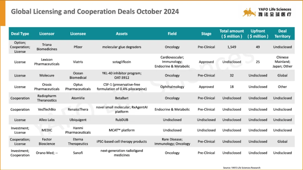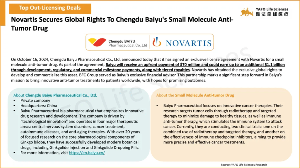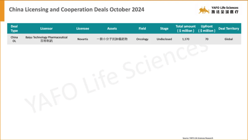 Between October 12 and 18, a total of 11 global licensing and cooperation deals were signed. In the China biotech sector, there was one notable out-licensing deal between BaiyuTechnology Pharmaceutical and Novartis for a small molecule anti-tumor drug, with a total deal value of $1.17 billion, including an upfront payment of $70 million.