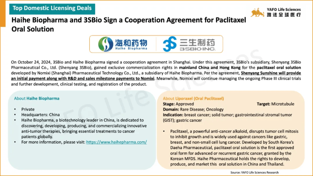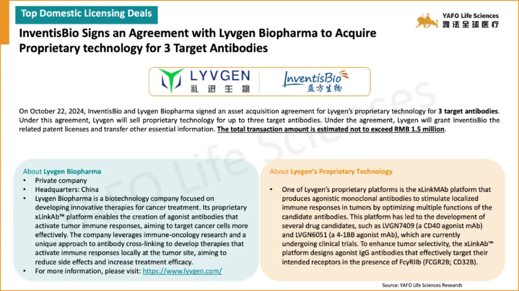 In China’s biotech industry, two domestic deals were recorded. Lyvgen Biopharma and InventisBio entered into an asset acquisition agreement for three target antibodies, while Haihe Biopharma and 3SBio signed a licensing agreement for the approved oral paclitaxel.