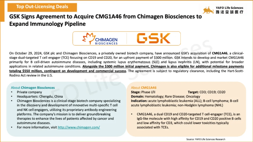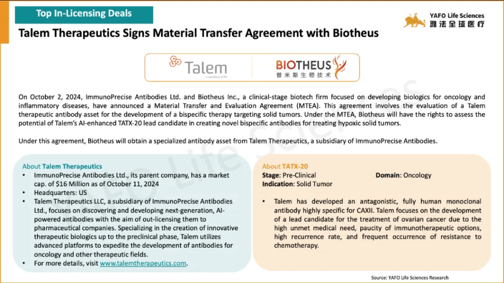 The top out-licensing deal of the month was between Chimagen Biosciences and GSK for the Phase I/II asset CMG1A46, valued at $850 million, with an upfront payment of $300 million. The sole in-licensing deal was between Talem Therapeutics and Biotheus for the oncology asset TATX-20, while the top domestic deal was between Bio-Thera Solutions and Gedeon Richter Pharmaceutical for an ustekinumab biosimilar, totaling $110 million with an $8.5 million upfront payment.