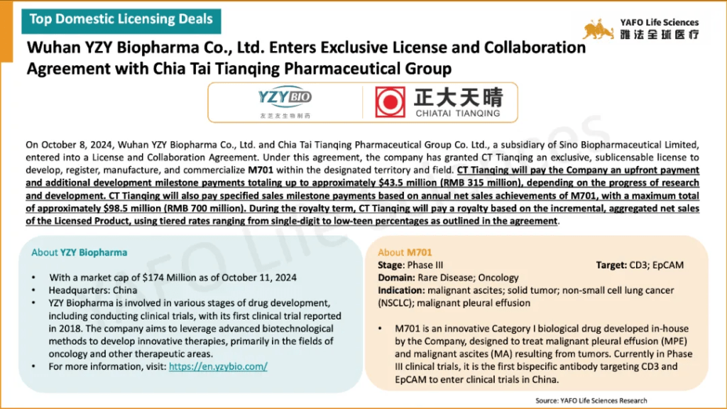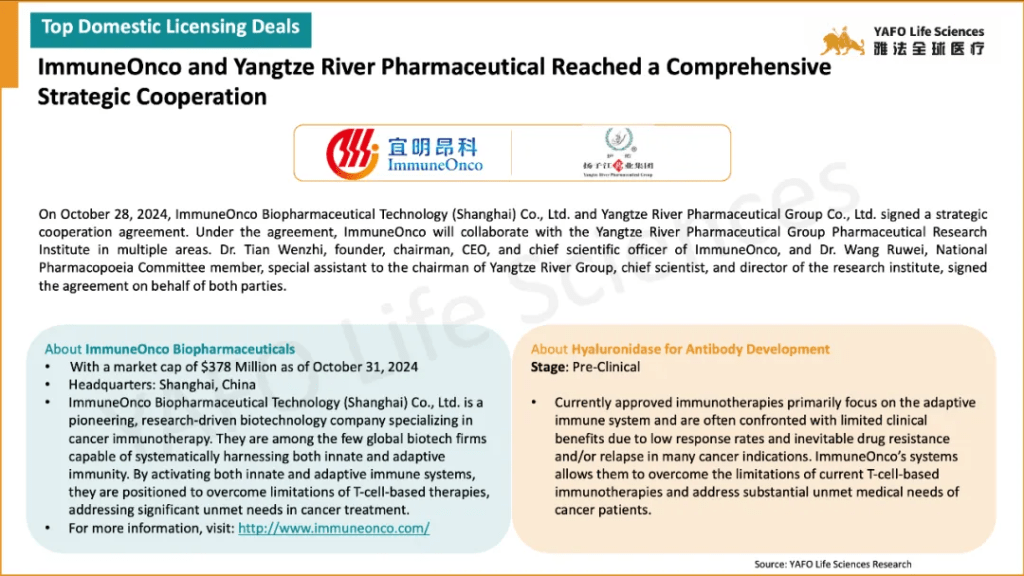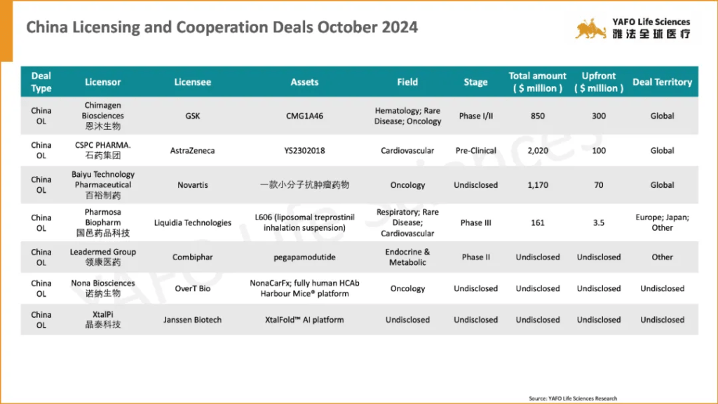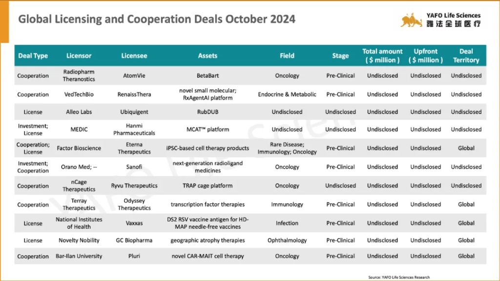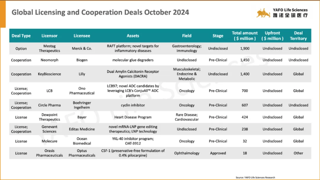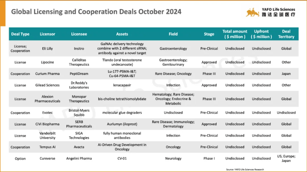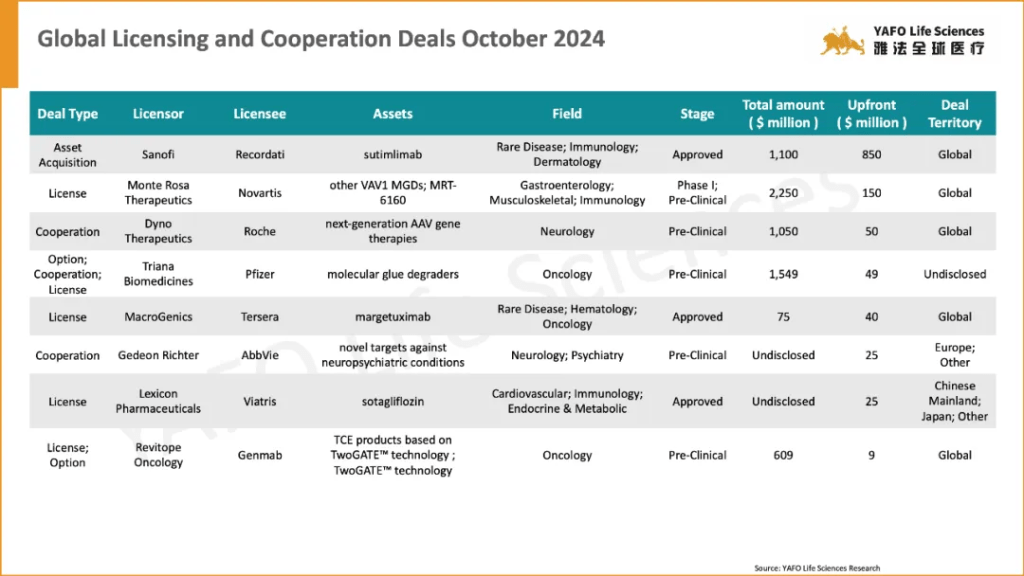 In October, a total of 73 licensing and cooperation deals were signed globally, marking an increase from September’s 60 deals. In China’s biotech industry, 15 of these deals were signed, consisting of 7 out-licensing, 1 in-licensing, and 7 domestic agreements.