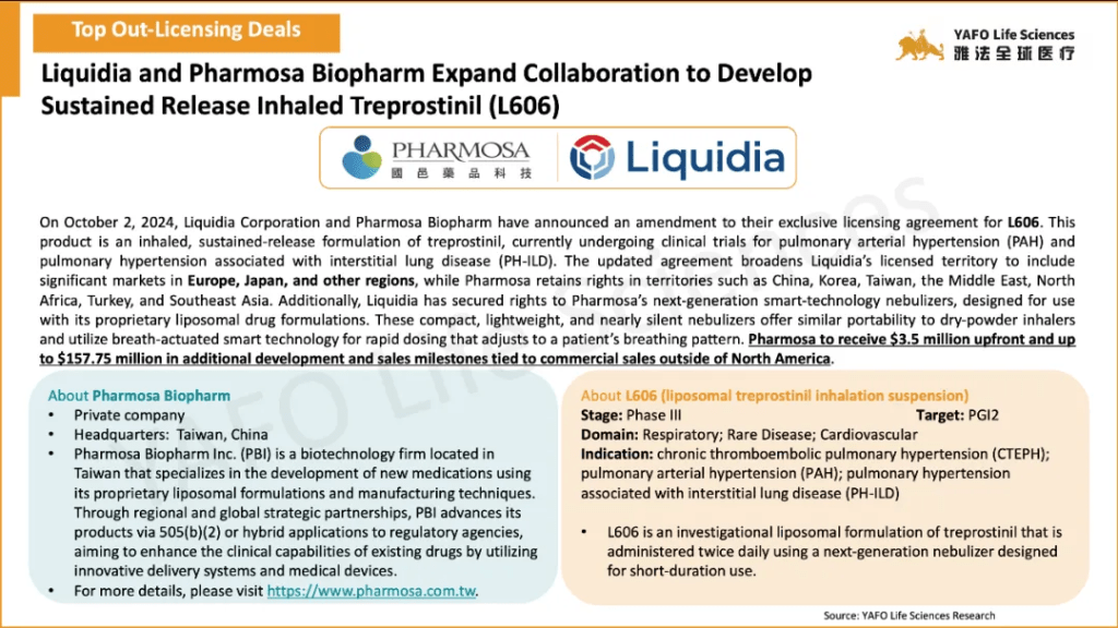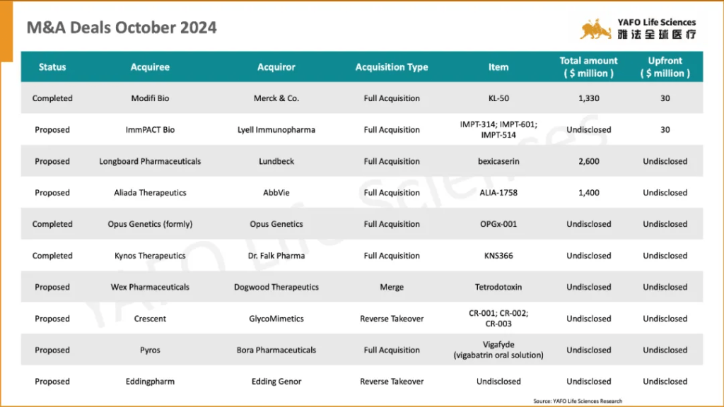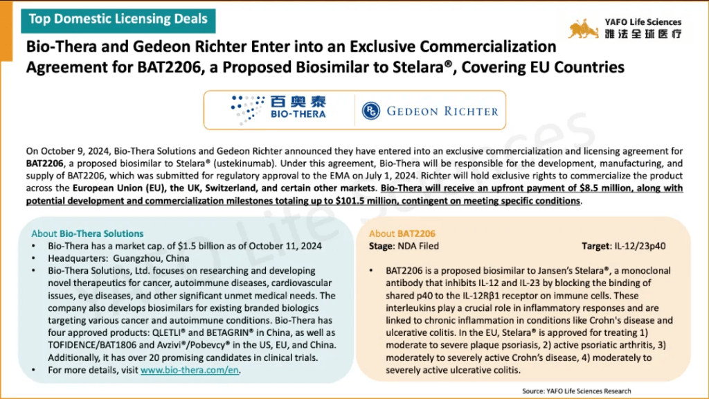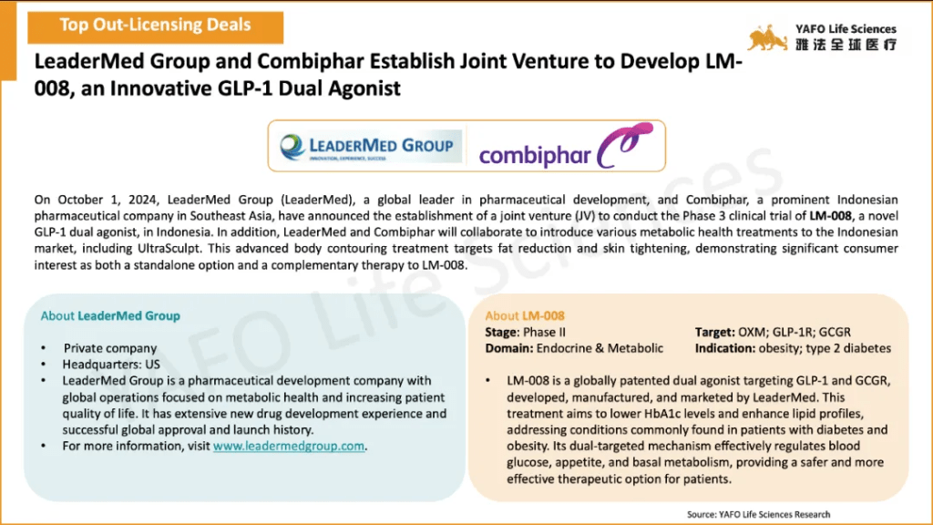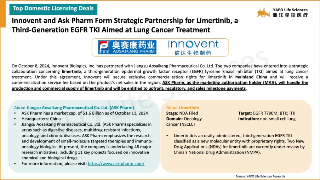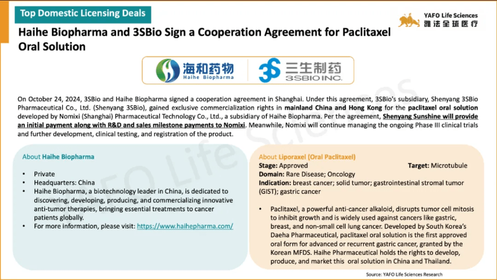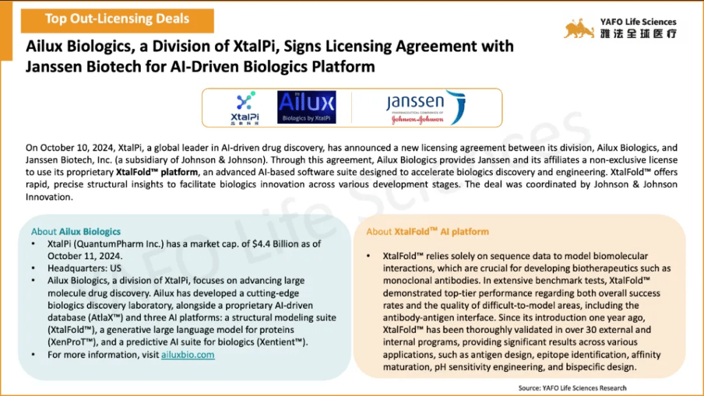 In October, a total of 73 licensing and cooperation deals were signed globally, marking an increase from September’s 60 deals. In China’s biotech industry, 15 of these deals were signed, consisting of 7 out-licensing, 1 in-licensing, and 7 domestic agreements.