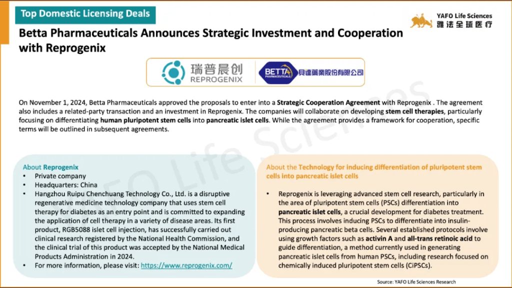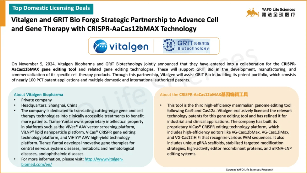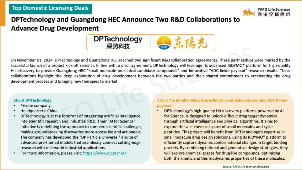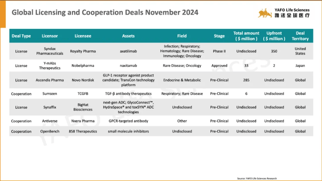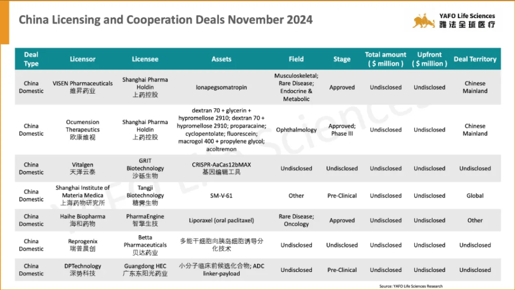 In the first week of November, 17 licensing and cooperation deals were signed in total. In the China biotech industry, there were three out-licensing deals and seven domestic deals.